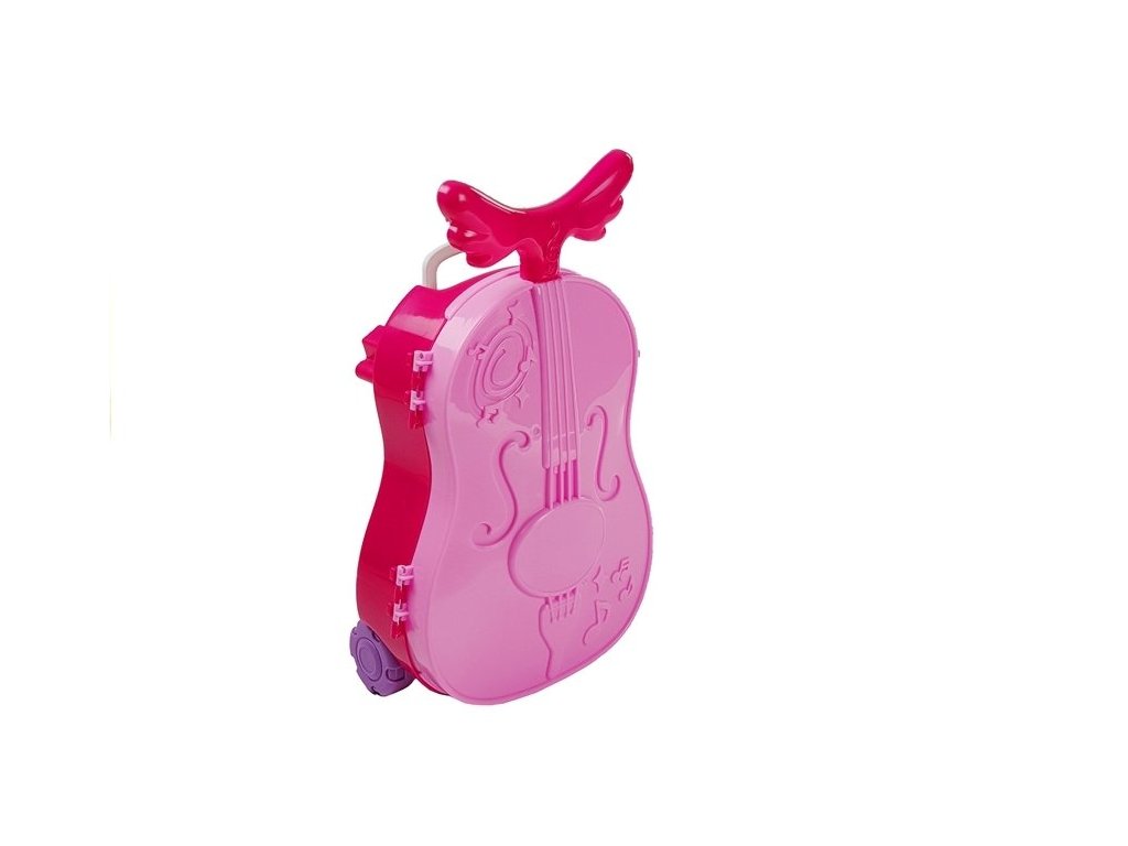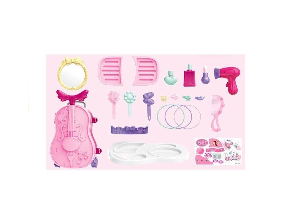 Козметичният комплект е идеална играчка за всички момиченца, които обичат да се гримират и обличат пред огледалото. Комплектът включва калъф, украсен с огледало, и множество пластмасови аксесоари, които осигуряват часове забавление. Възможността да играят на козметичка със сигурност ще зарадва всяко малко момиче. Цветният тоалетен стол с колелца и дръжка значително улеснява пренасянето от калъфа с форма на цигулка.