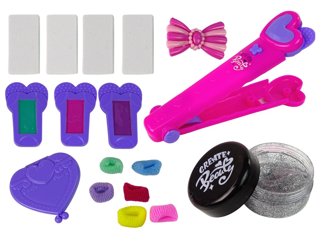 Прическата може да бъде допълнена с останалите аксесоари от комплекта – цветни ластици, фиба с форма на панделка, гребен, резервни гъбички за пресата, както и гел с блясък!