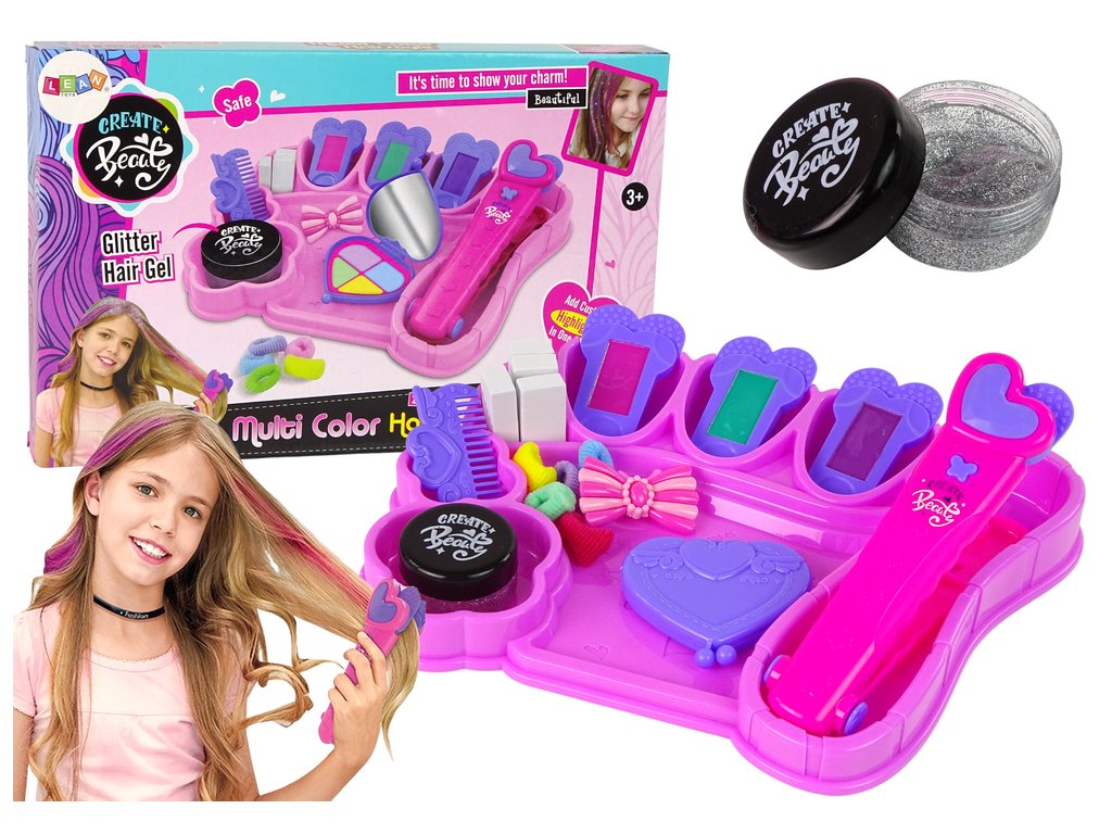 Отличен комплект стилизиращи инструменти за коса за малки момичета. Включва преса за създаване на цветни кичури с подменяеми вложки. Комплектът е идеален за момичета, които обичат да си играят като фризьорски салон.