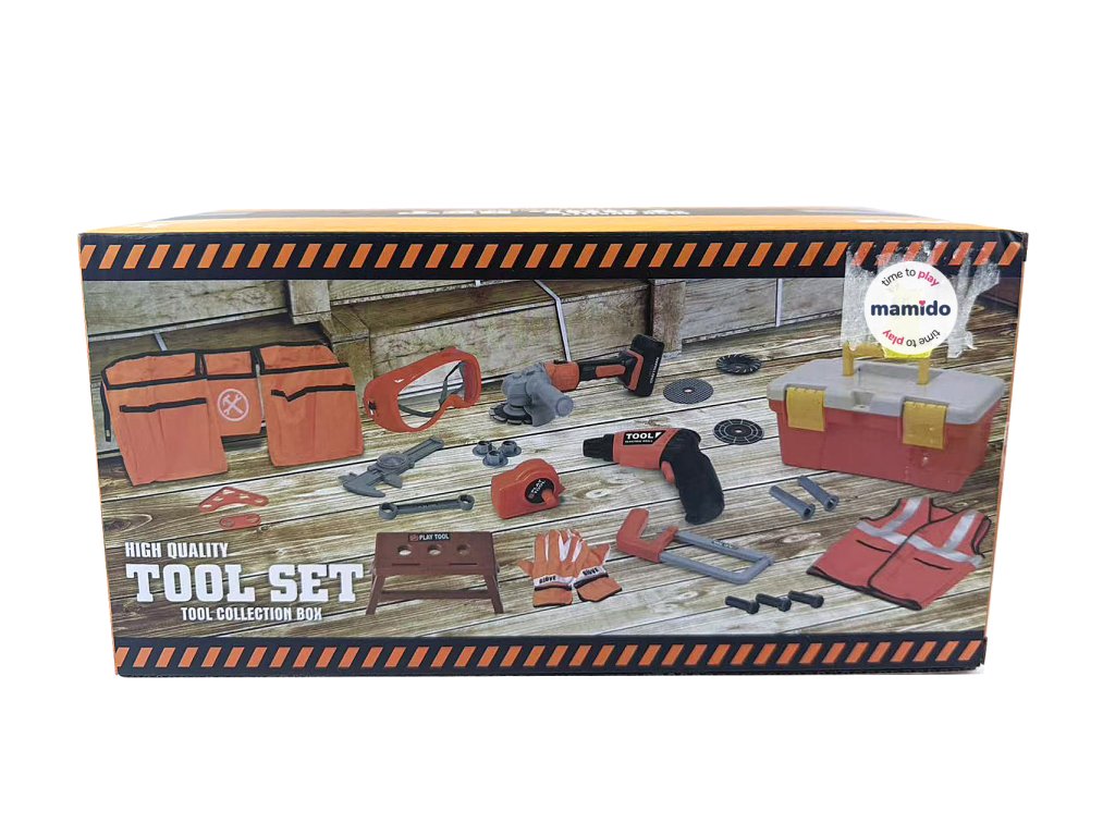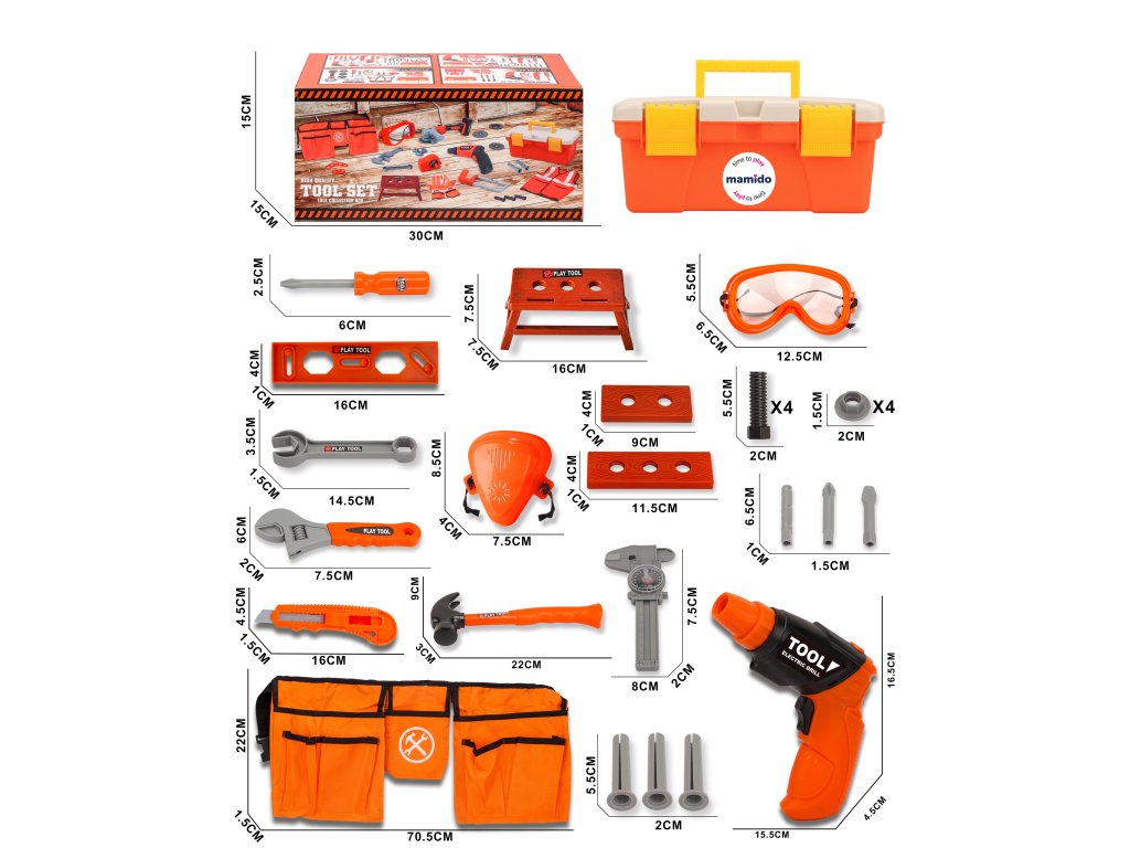 Стартира въображението и игривото учене. Пълна комплектация с инструменти, куфар, акумулаторен винтоверт, чук, винтове, очила, работен елек, колан за инструменти и други аксесоари. Идеален за игра на работилница, учене за разпознаване на инструменти и развитие на фината моторика. Благодарение на кутията всички части могат лесно да се съхраняват и пренасят.