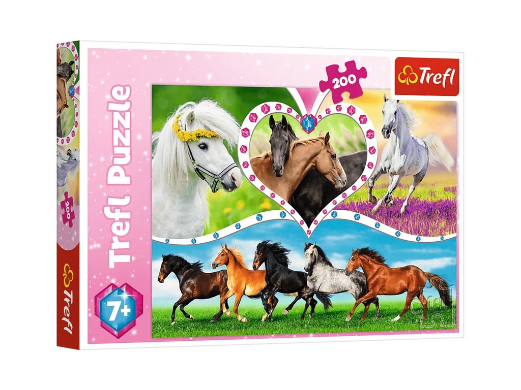 Красиви коне е пъзел, съставен от 200 части, които образуват колаж с изящни коне. След сглобяване се получава изображение с размери 480x340 мм.