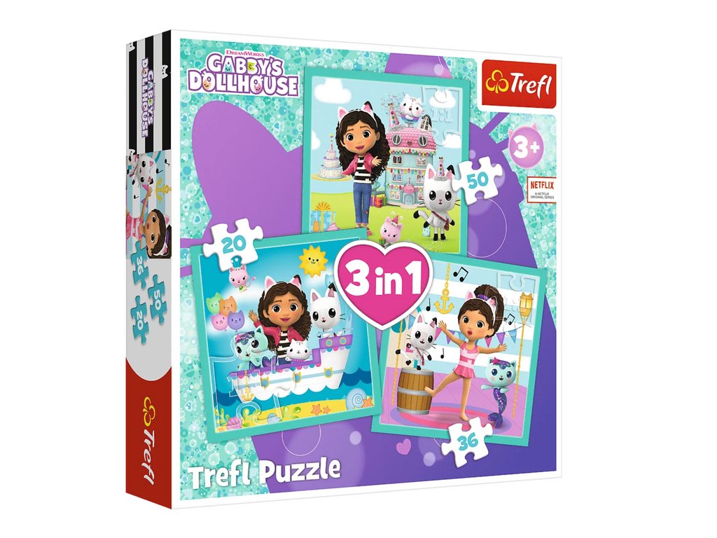 Пъзел Пъзел Кабинината магическа къща 3в1 Trefl включва три отделни пъзела, вдъхновени от приказката Габининът магически дом. С различния брой елементи, те са подходящи както за по-малки, така и за по-големи деца. Изработени от екологични материали, идеални за деца над 3 години.