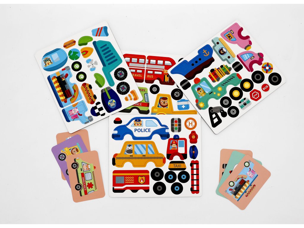 В опаковката ще намерите 66 магнитни части с различни елементи на автомобили, автобуси, лодки, полицейски или спасителни превозни средства, които могат да се комбинират според собственото ви въображение или според приложените шаблони. Включени са също 12 примерни картинки на 6 двустранни карти, които показват на децата как могат да сглобят отделните превозни средства.