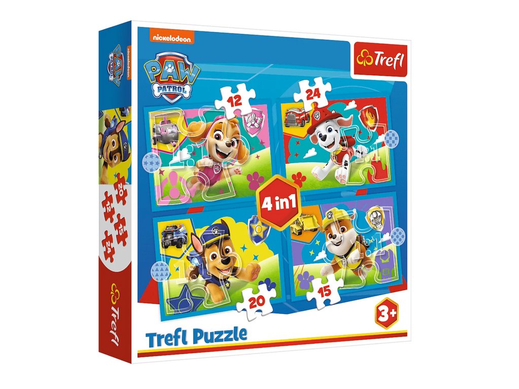 Пъзел Пес Патрул Бягащи кучета 4в1 Трефл включва четири отделни картинки, вдъхновени от любимите приключения на героите от Пес Патрул. С различен брой парчета, този комплект е подходящ както за по-малки деца, така и за по-големи малчугани. Изработен от екологични материали, безопасни и идеални за деца над 3 години.