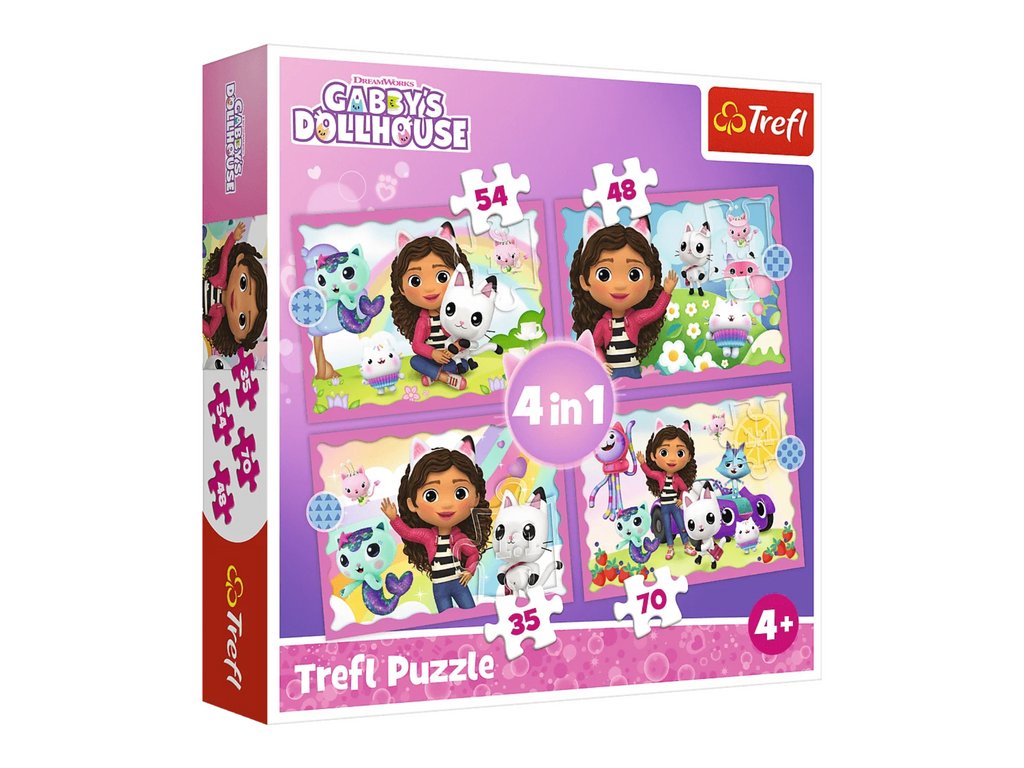 Пъзел Приключения на Габи 4в1 Trefl представя сцени от любимия анимационен сериал „Габиният вълшебен дом“. Пъзелът съдържа четири изображения с различен брой елементи (35, 48, 54 и 70), идеални за деца над 4 години.