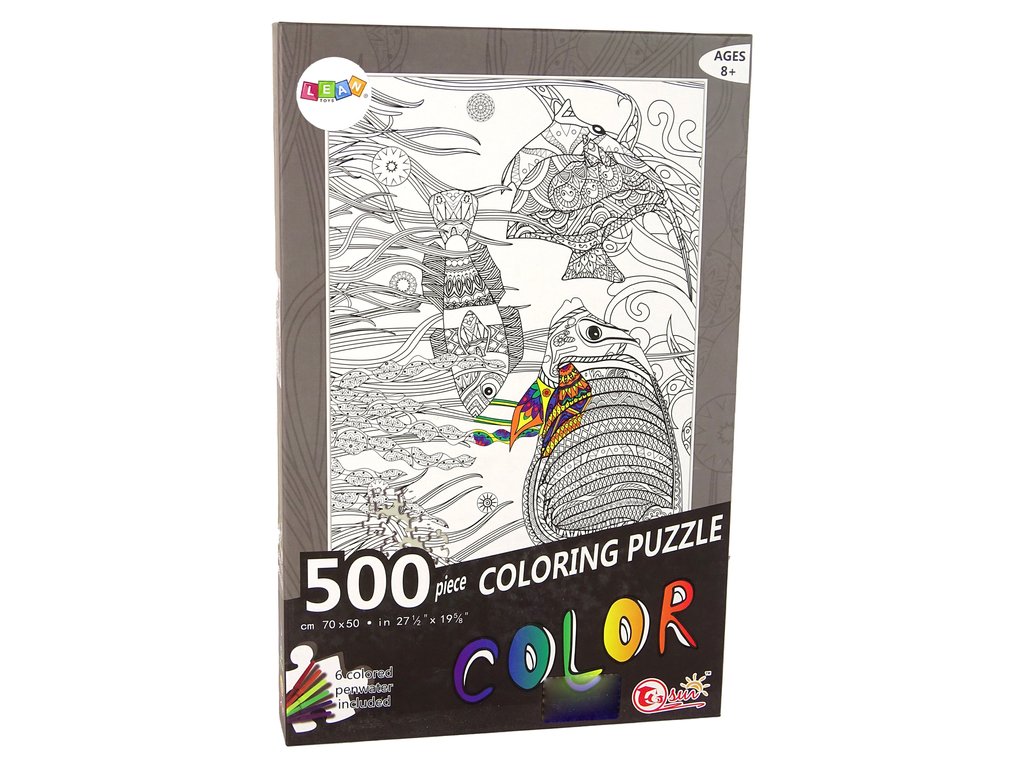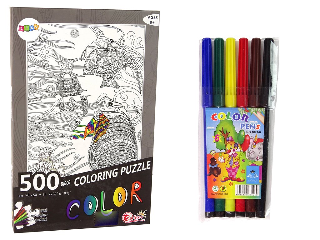 Комплектът включва 500 черно-бели части и 6 флумастера, с които можете да оцветите пъзела според вашето въображение. Пъзелът изобразява риби в океан, заобиколени от водни растения.