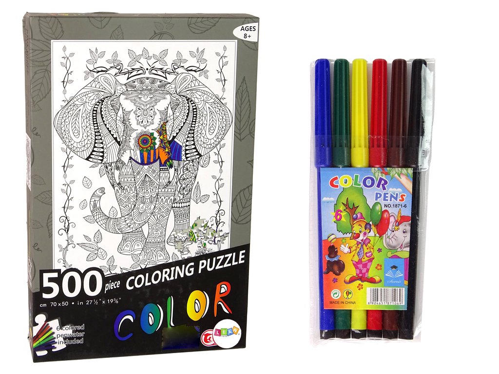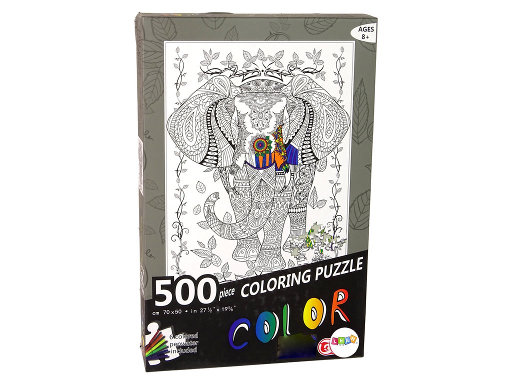 В опаковката ще откриете 500 черно-бели части за пъзела и 6 маркера, които ви позволяват да оцветите изображението по въображение. Пъзелът изобразява красив слон, обграден с листа.
