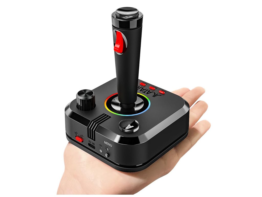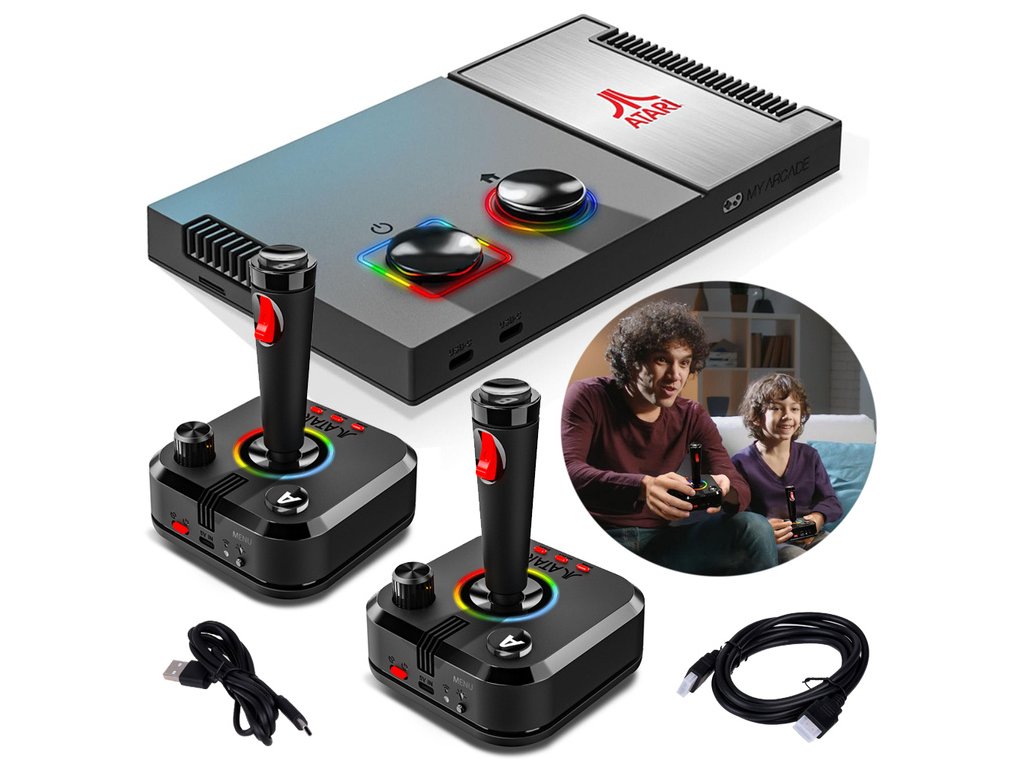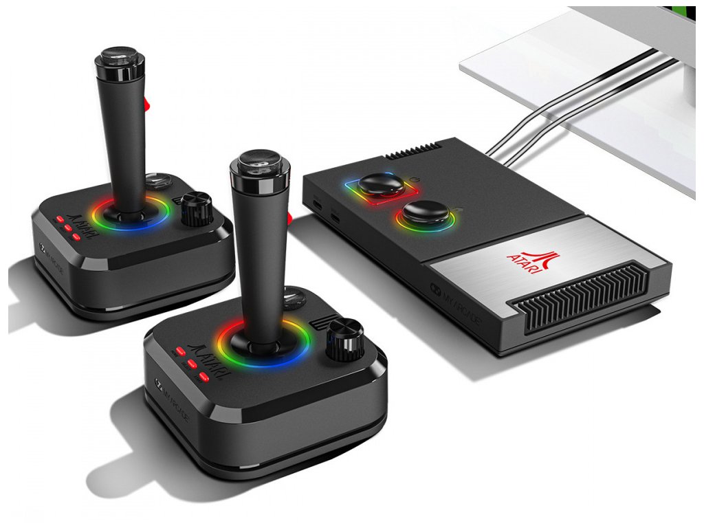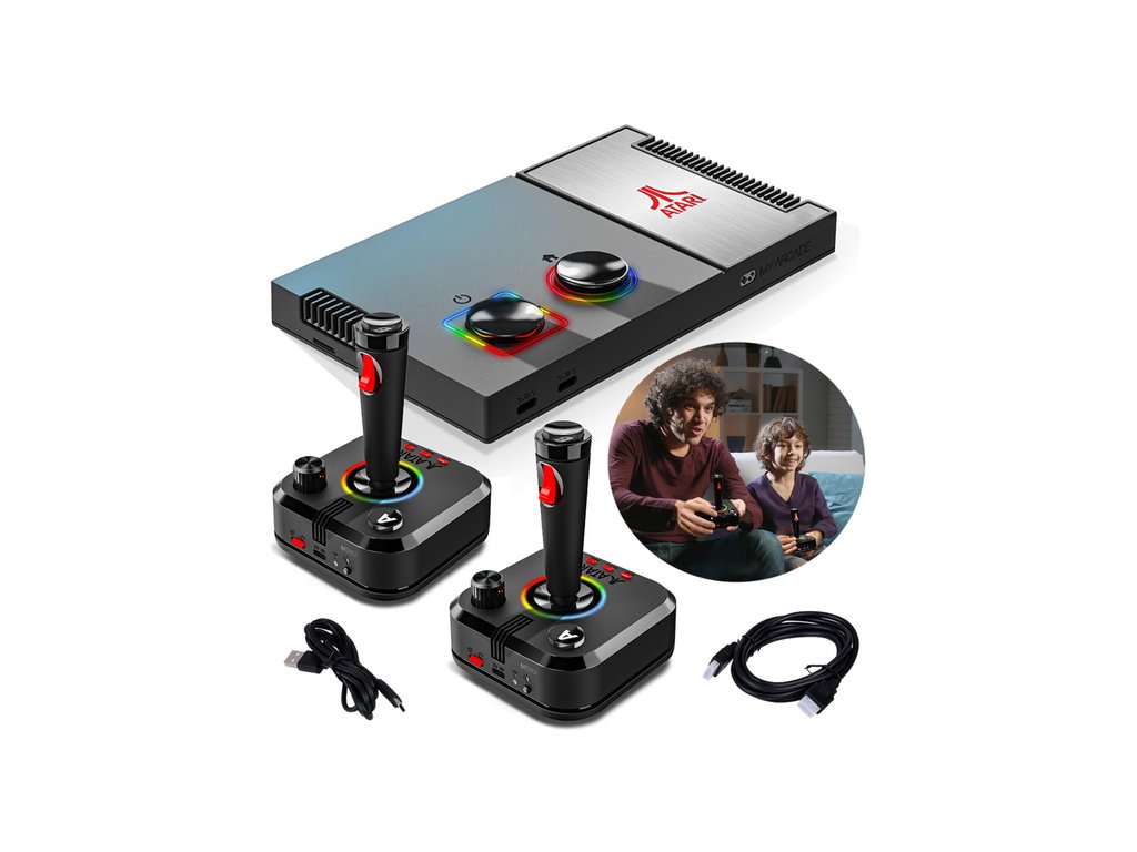 - Два безжични джойстика с честота 2.4 GHz, проектирани специално за феновете на класическите игри, като същевременно запазват духа на оригиналните контролери Atari. Вградените палетки позволяват игра на емблематични заглавия като Breakout® и Warlords®, гарантирайки автентично гейминг изживяване.