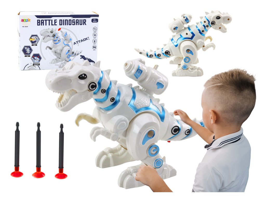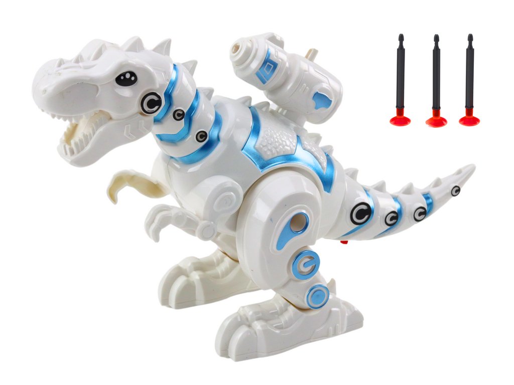 Робот динозавър с изстрелвач на стрели със светлини и звуци бял