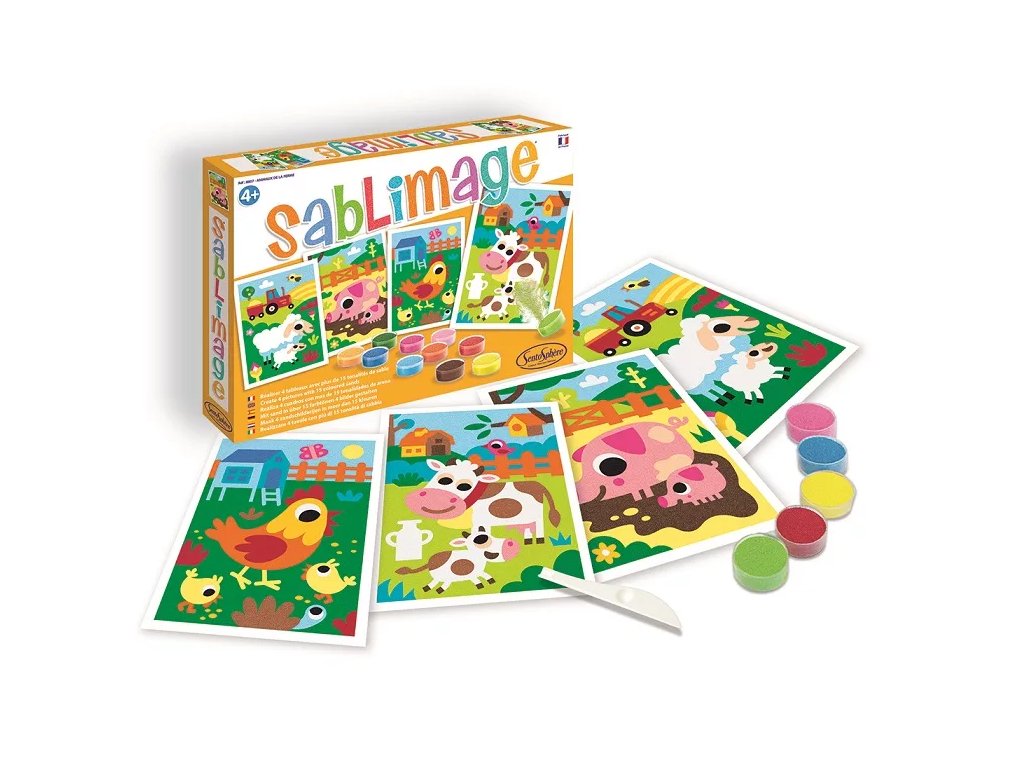 Комплектът съдържа предварително отпечатани картинки на селскостопански животни (прасе, крава, овца, кокошка). Децата отлепват предварително залепените повърхности и ги поръсват с пясък в различни цветове. По този начин могат да се създадат цветни пясъчни картини без излишно замърсяване на пространството.