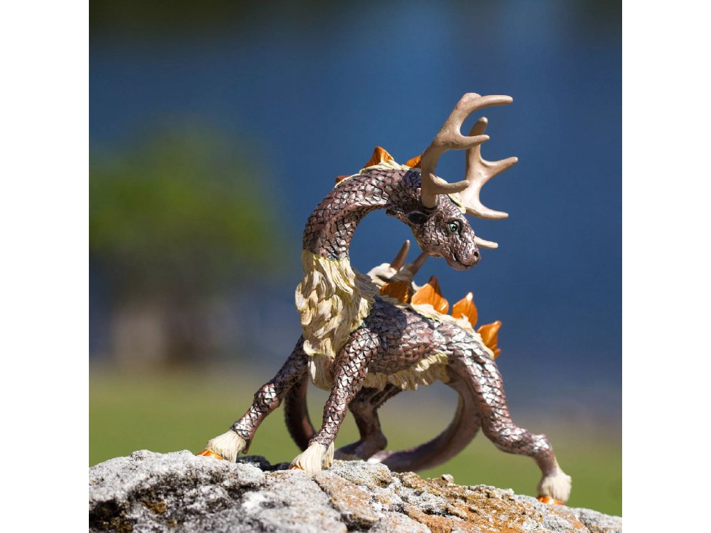 Моделът съчетава люспи, бодли и дълга опашка на дракон с рога, копита и козина на елен. Прецизната детайлна изработка подчертава контраста между хищната сила и плахата природа на създанието, което придава на фигурката характер, подходящ за колекционери и за игра.