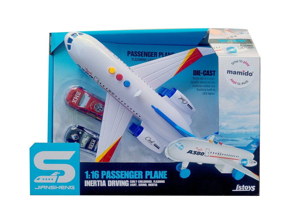 Самолет в мащаб 1:16, който ще очарова всички малки пилоти и пътешественици. Моделът е оборудван с цветни бутони, които активират звуци и мигащи светлини, правейки играта още по-реалистична. Благодарение на функцията инерционен механизъм, самолетът се движи лесно напред. В опаковката ще намерите и две колички 1:16, с които децата ще се насладят на още повече сценарии за игра. Чудесен избор за развитие на креативността, въображението и двигателните умения.