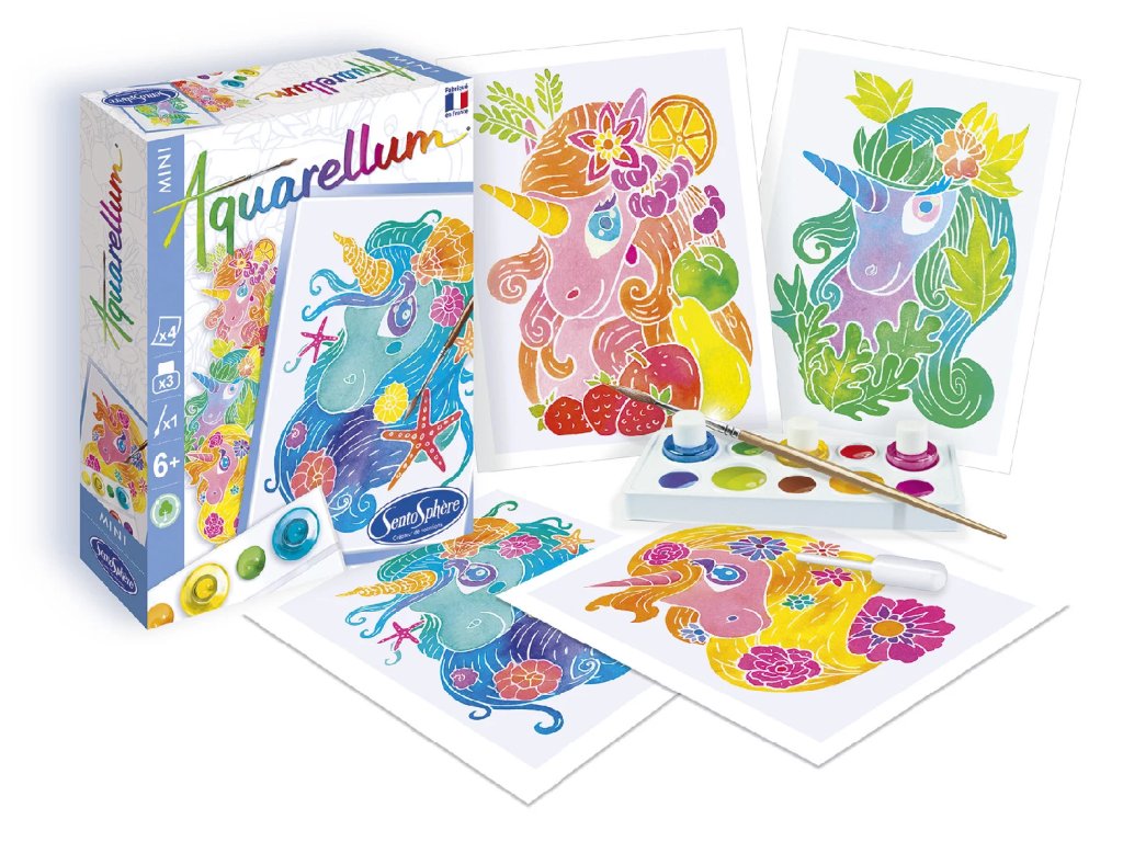 Комплектът съдържа цветни мини илюстрации с маскирани контури, които магически се появяват при движение с четката. Маскирането предотвратява залепването на боята върху избрани места, така че можете да рисувате точно в рамките на линиите. Акварелните бои се смесват добре и позволяват наслагване на слоеве за богати цветови ефекти.