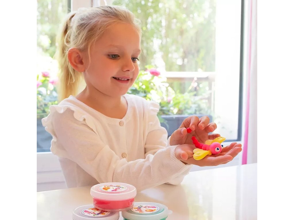 Моделираща маса, която не залепва по пръстите и не оставя петна. Ароматен пластилин с лека и еластична текстура, която изсъхва на въздух и позволява да запазите творенията по-дълго; цветовете се смесват перфектно помежду си.