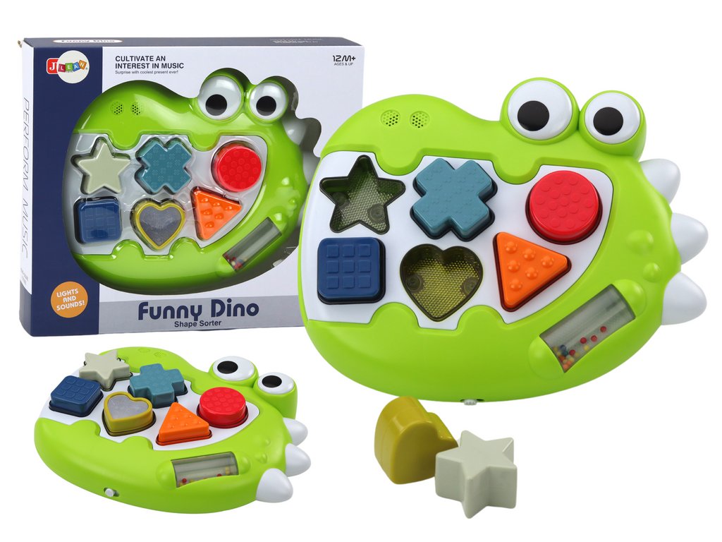 В комплекта са включени шест различни геометрични фигури, с които децата могат да играят. Всяка фигурка има свое място в динозавъра - различен цвят и уникални тактилни ефекти като дрънкалка, огледалце или релефна повърхност. Това помага на децата да усъвършенстват разпознаването на форми и цветове, както и да развиват допир и слух.