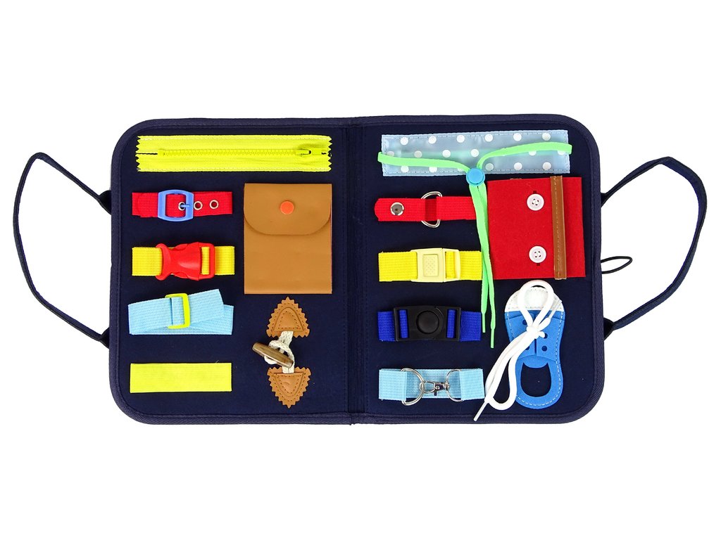 Куфарчето е изработено от филц – мек и приятен материал на допир, който е лесен за пренасяне. Детето може да го вземе със себе си на разходка или пътуване. Всеки елемент има различна форма и текстура, което стимулира чувството за допир. Умения като закопчаване и превключване между различните видове закопчалки стават лесни и естествени.