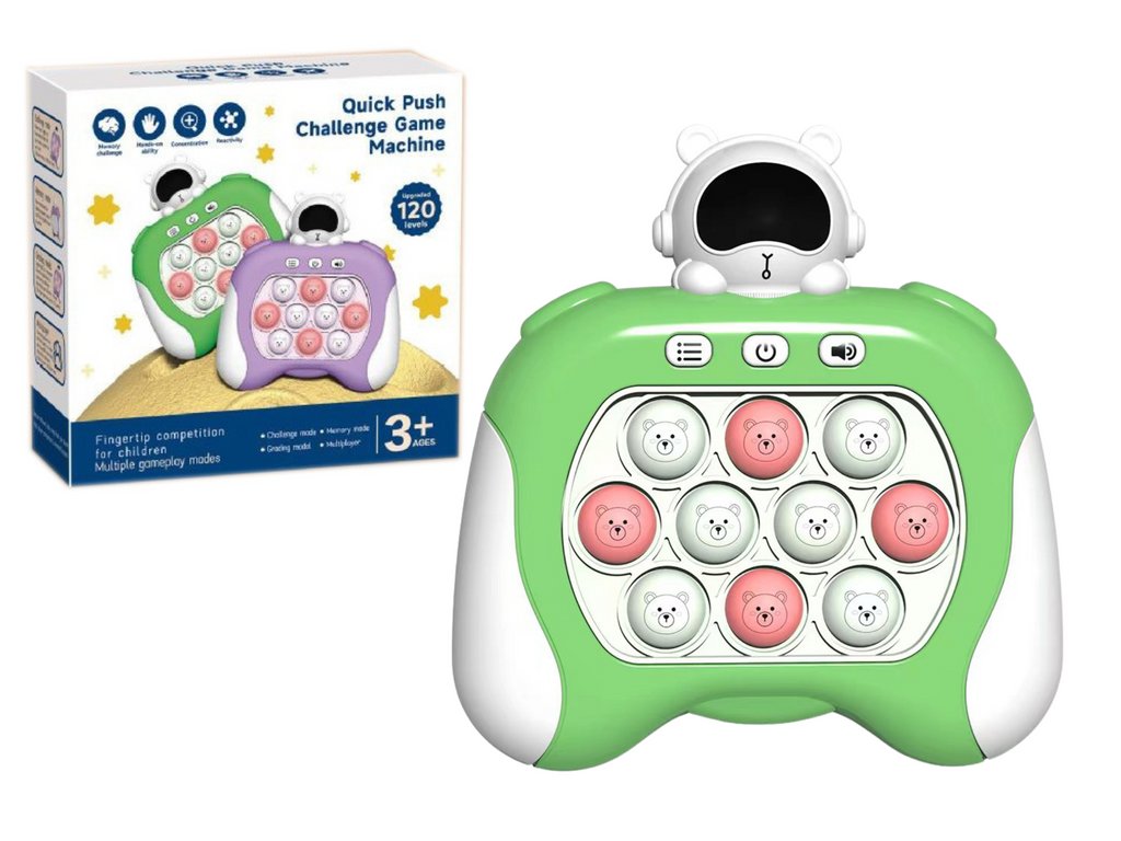 Сензорична игра Pop It Space със зелени ефекти с космическа тематика предлага интерактивно забавление с комбинация от светлини и звуци, което привлича както деца, така и възрастни. Играта изисква от играчите да наблюдават и повтарят последователности от светлинни сигнали чрез натискане на съответните „балончета“, като по този начин не само забавлява, но и развива паметта и когнитивните умения.