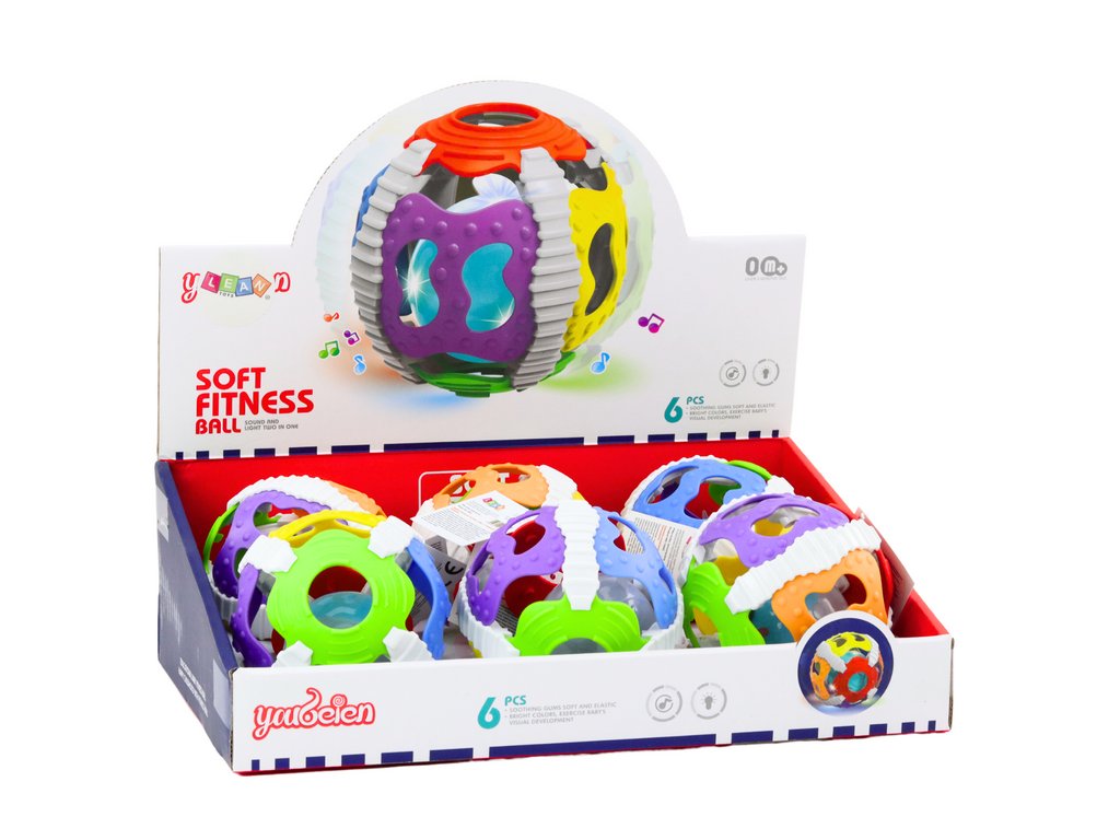 Вътре в топката се намира пластмасова топче, което при движение издава звуци и светва, стимулирайки слуховите и зрителни сетива. Различните текстури и цветове на топката поддържат сензорното възприятие и координацията на движенията, мотивирайки детето към по-нататъшно откриване и развитие.