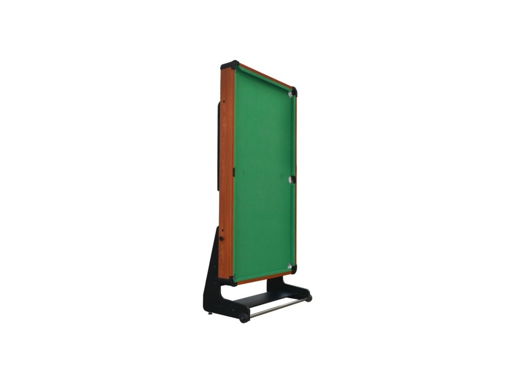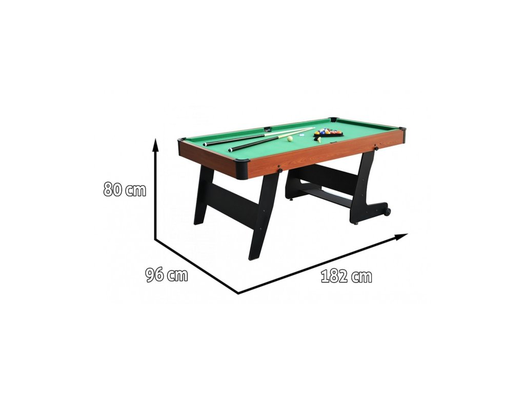 Насладете се на игрите с тази стабилна и елегантна маса за билярд с размер 6 фута. Игралната повърхност е покрита с устойчив зелен плат, джобовете с мрежи позволяват лесно изваждане на топките, а здравата MDF конструкция осигурява дълъг живот. Масата може лесно да се сгъне във вертикално положение след игра, което спестява място. Освен това има колелца за лесно преместване и регулируеми по височина крака.