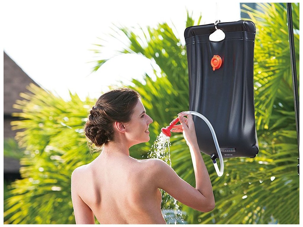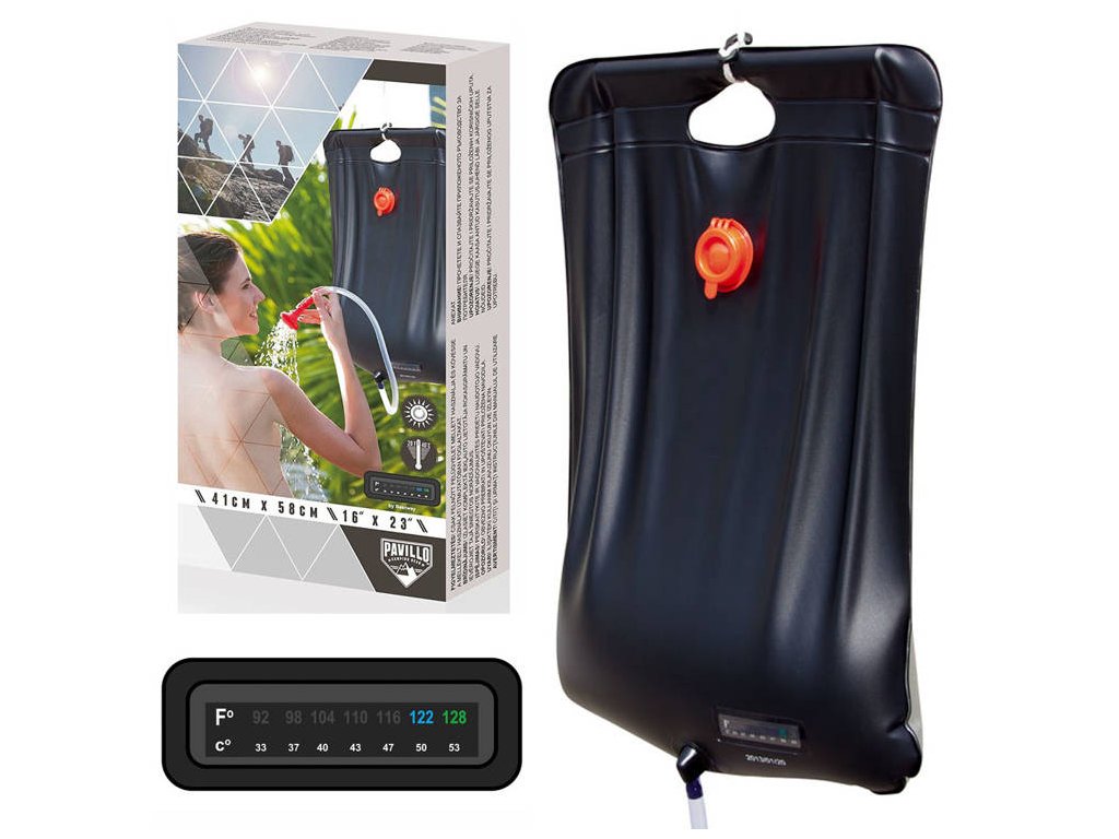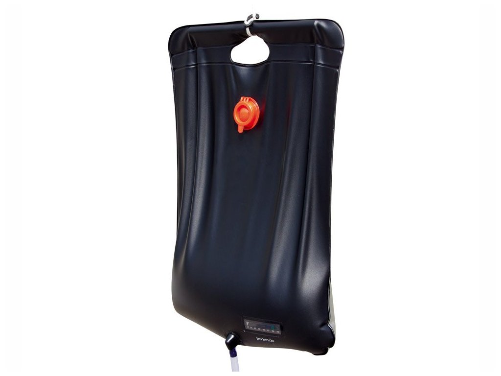Соларен туристически душ, подходящ за къмпинг и градина. Позволява загряване на вода със слънчевата енергия до 53ºC, душът е снабден със затварящ се кран, маркуч с душ глава и здрава дръжка.