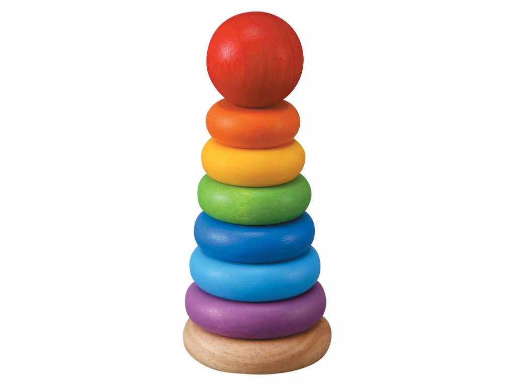 Комплектът включва дървени кръгове в няколко цвята и размера, които децата постепенно нанизват на централния прът. Сгъваемата конструкция улеснява работата и съхранението.