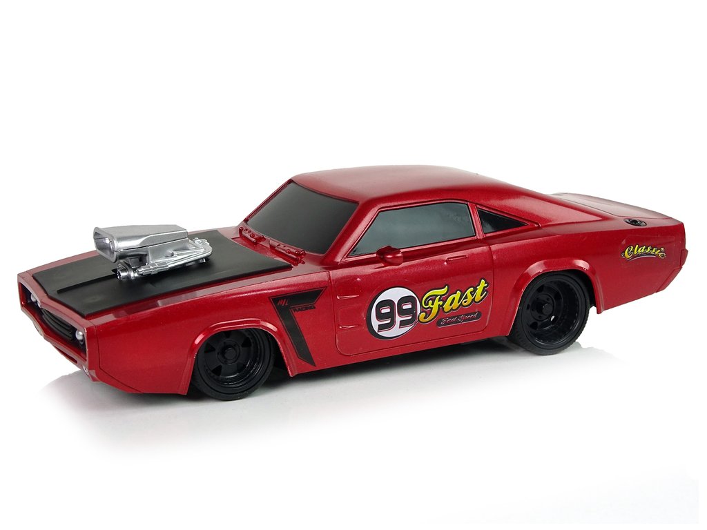Гумените гуми осигуряват отлично сцепление с повърхността. Колата разполага с две отделни бутона за движение напред/назад и завиване наляво/надясно. Моделът е в червен цвят с декоративни стикери.