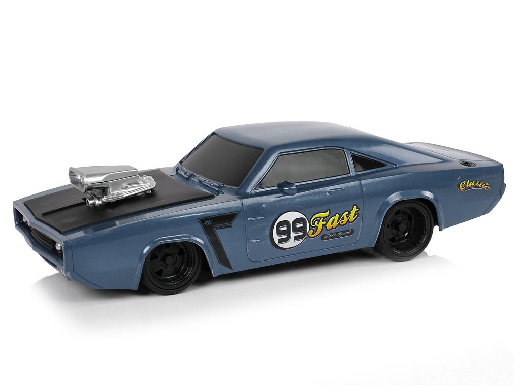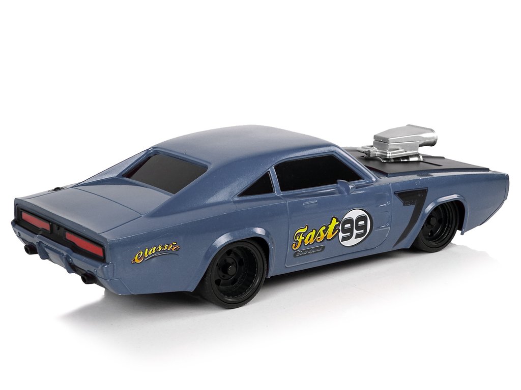 Гумени гуми гарантират добро сцепление с повърхността. Колата разполага с две отделни бутона за движение напред/назад и завиване наляво и надясно. Моделът е в сив цвят с стикери за допълнителен ефект.