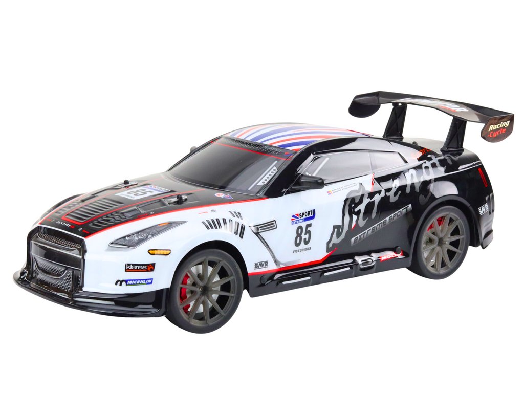 Голяма Спортна кола с дистанционно управление R/C 1:8 със светлини и звуци с динамичен дизайн в черно-бял десен и реалистични светлинни и звукови ефекти. Издръжлива на удари, идеална за интензивни състезания и лесна за управление благодарение на дистанционно с честота 2,4 GHz. Този модел е отличен избор за любителите на бързите коли и вълнуващите забавления.
