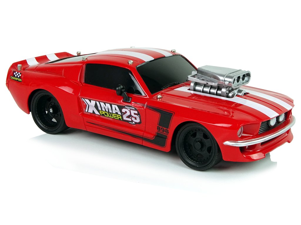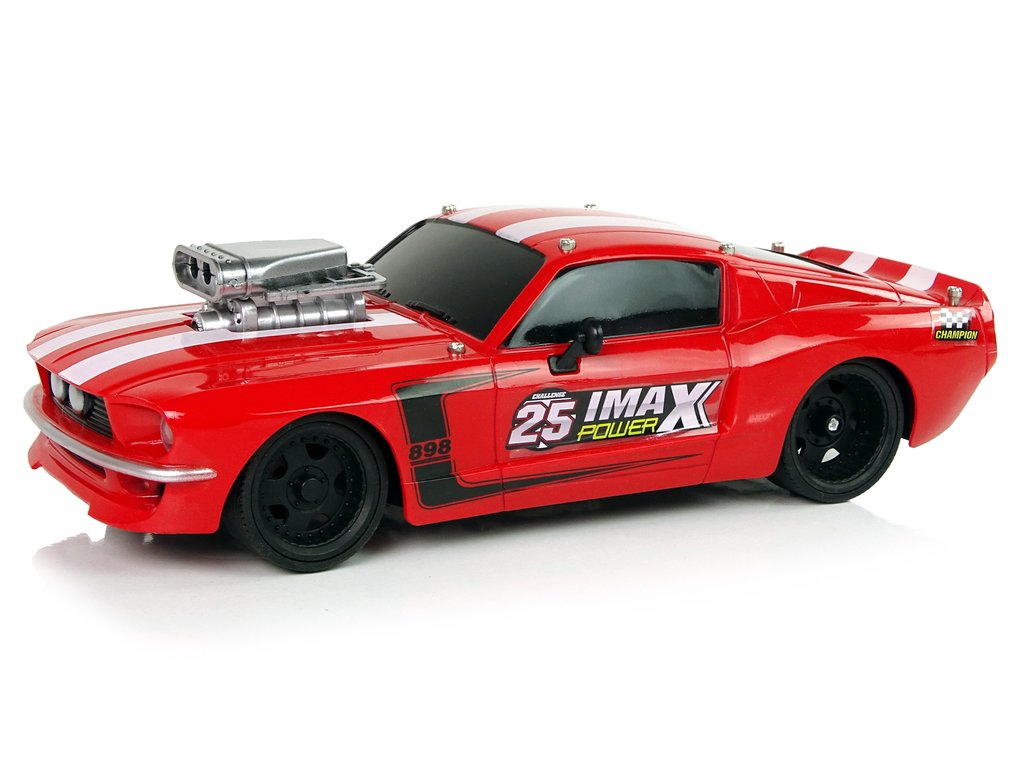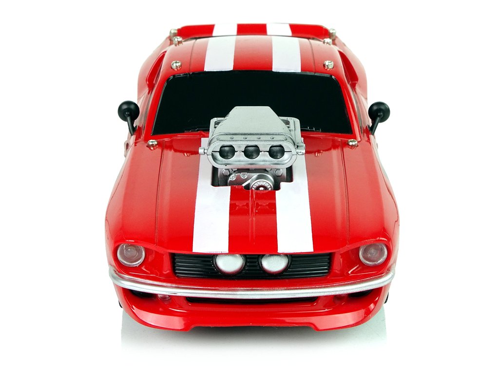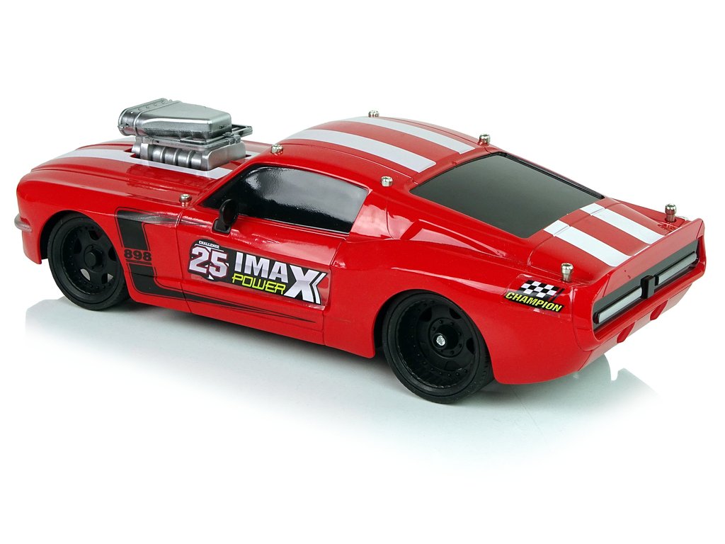 Спортна кола с дистанционно управление RC 1:16 червена има лека и здрава конструкция, спортен дизайн с два бели ивици на покрива и сребрист компресор на капака на автомобила. Гумените гуми осигуряват отлично сцепление с повърхността при управление на колата.
