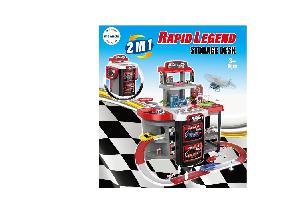 Състезателната станция Rapid Legend предлага богата игрова среда: многоетажен гараж, изходна рампа, сервизна станция и състезателна писта. Комплектът се трансформира в компактен куфар с издърпваща се дръжка след натискане и щракване. Играчката е идеална за малки фенове на коли и скорост.