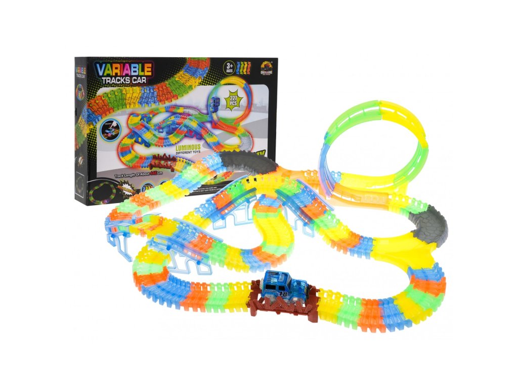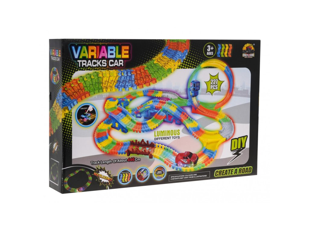 Светеща писта за коли Variable 227 части с осветление и луупинг е идеална за деца над 3 години. Пистите са гъвкави и могат да се сглобяват в различни комбинации, завъртат, вдигат и дори променят по време на движението на количката. Флуоресцентните части светят в тъмното, което добавя допълнителна забавност. Количката в комплекта е оборудвана със светодиодно LED осветление, което създава впечатляващ ефект при игра в тъмнина. Количката се захранва с две батерии AA 1,5V, които не са включени в опаковката. За да я включите, просто натиснете бутонът на покрива ѝ. Общата дължина на пистата е 446 см.