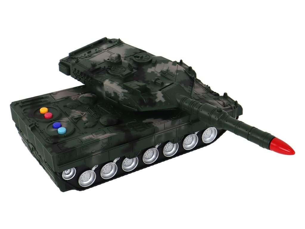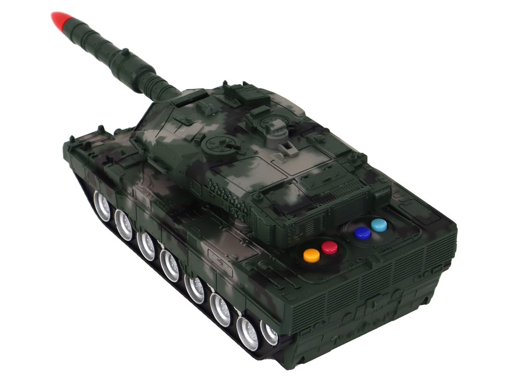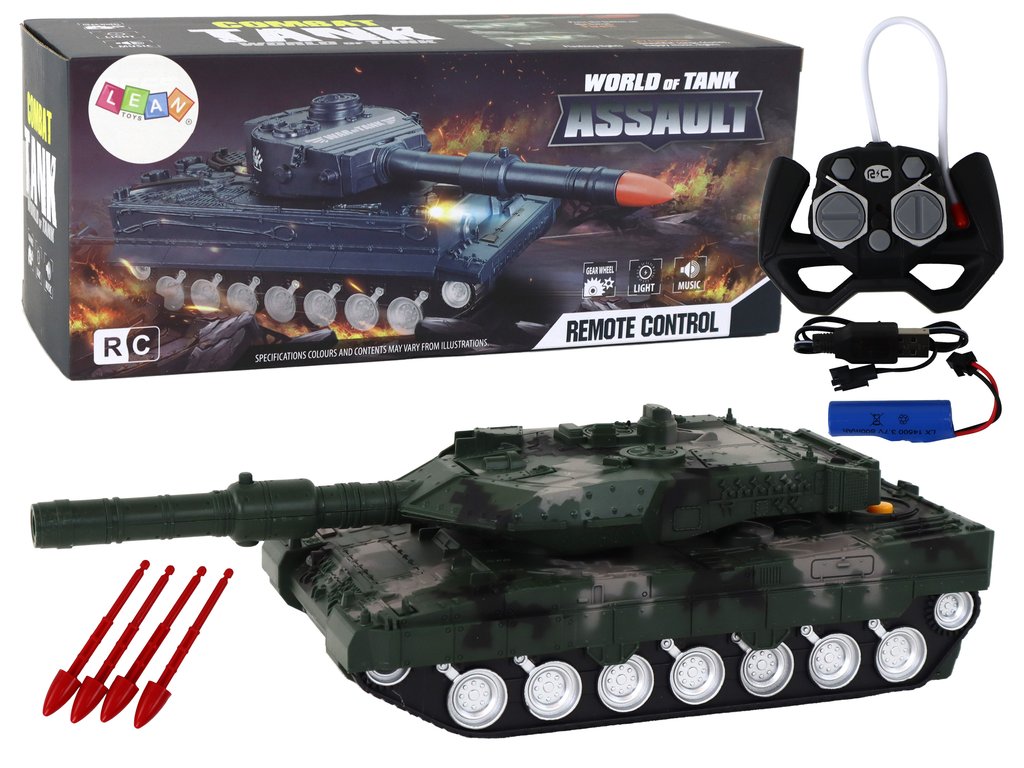 Комплектът включва ракети, които осигуряват грандиозни стрелби и състезания. Танковият модел разполага и с звукови и светлинни ефекти, които ви пренасят направо в сърцето на виртуалната битка. На танка има цветни бутони, с които можете да сменяте музиката и да създадете още по-интерактивна атмосфера.