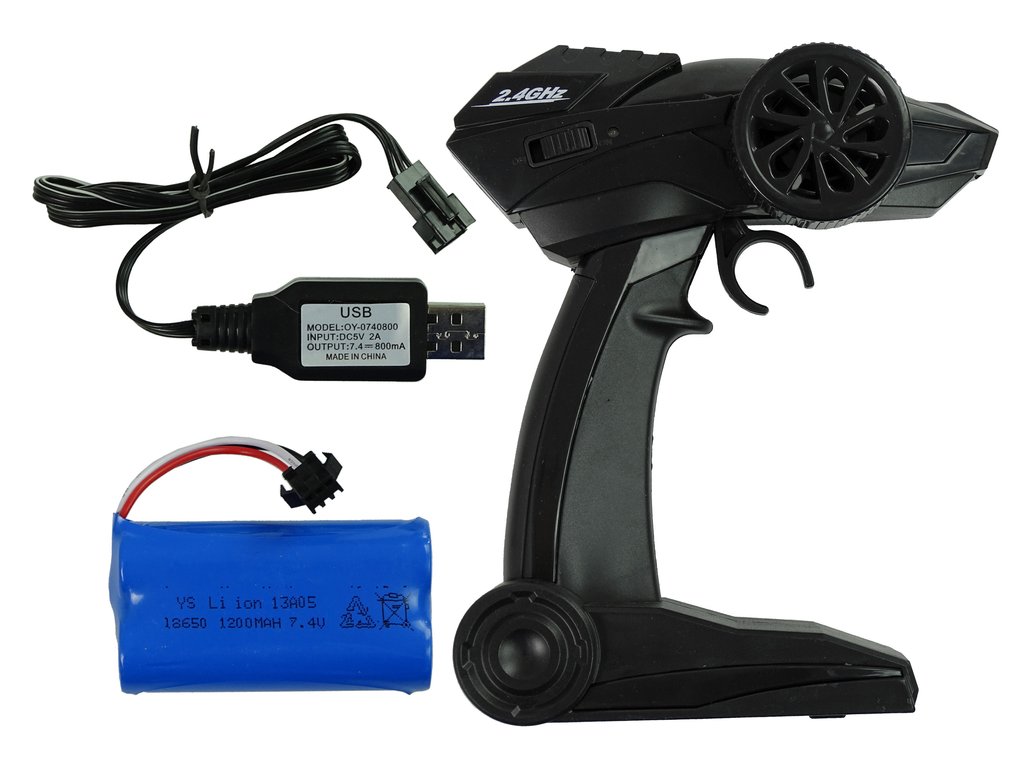 Безжичното дистанционно управление, включено в комплекта, работи на честота 2,4 GHz, което позволява състезания в по-голяма група без никакви смущения.