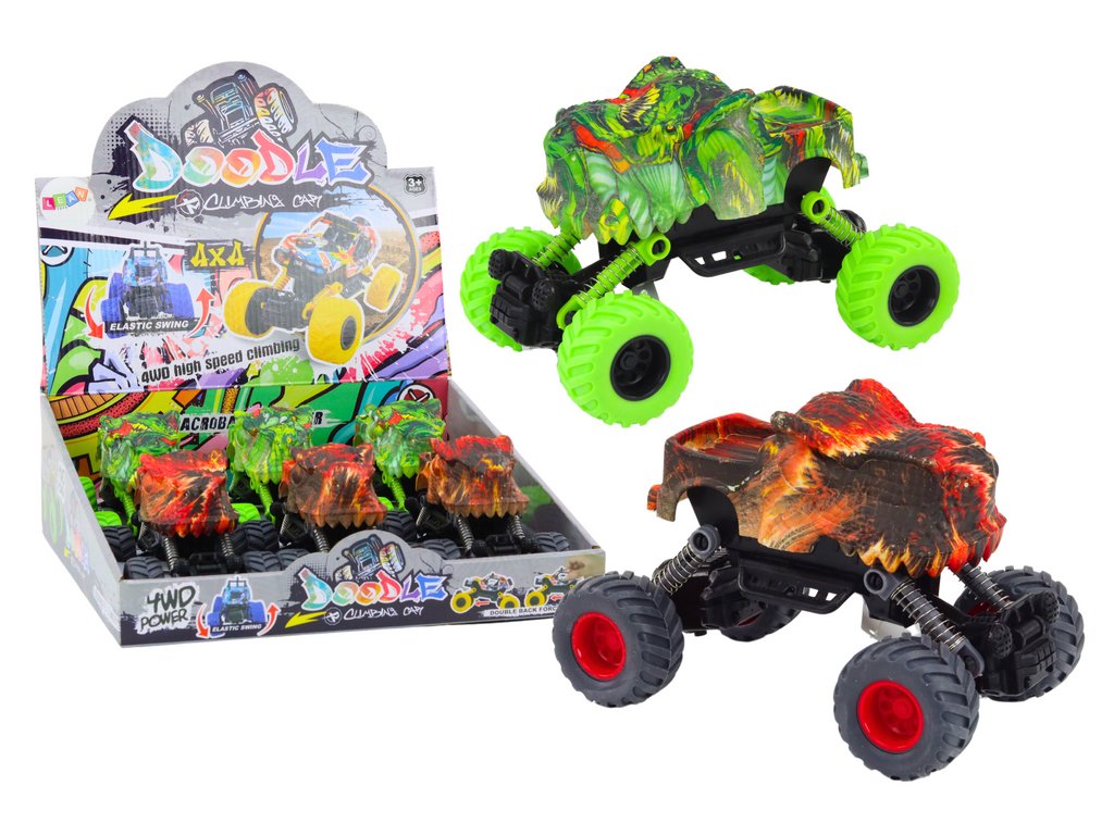 Тази уникална играчка комбинира две вълнуващи категории: автомобил и динозавър. Колата е с форма на динозавър, което ѝ придава уникален и забавен дизайн, съчетавайки света на динозаврите с офроуд превозно средство. Оборудвана е с устройство за задвижване чрез триене, което ѝ позволява да се движи напред и назад, предоставяйки динамично забавление. Колелата са закрепени на пружини, позволяващи скокове и повдигане, добавяйки екшън елементи в играта.