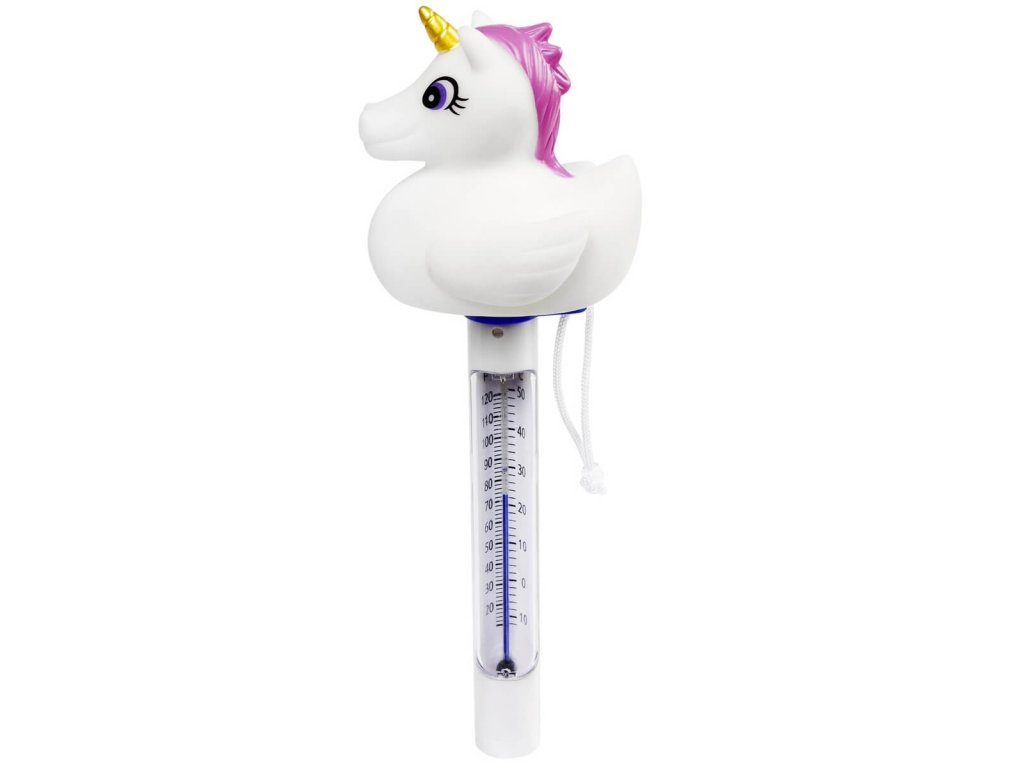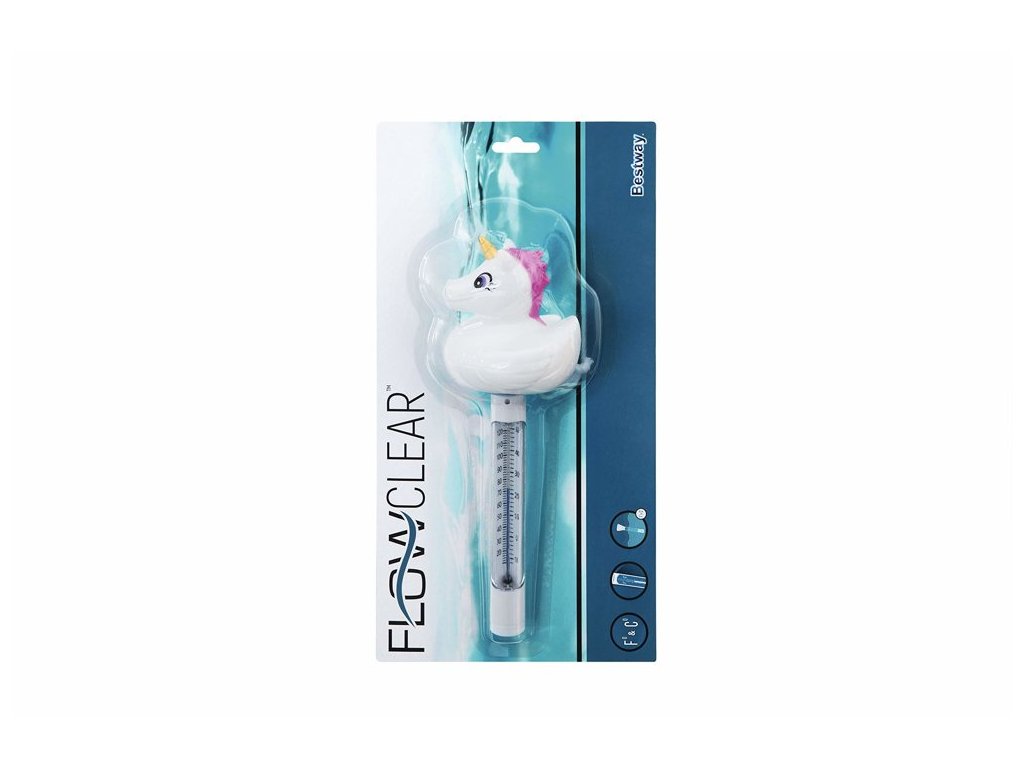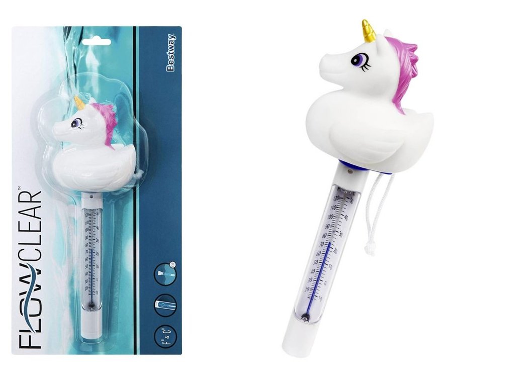 Термометър за басейн Еднорог Bestway е практичен аксесоар за вашия басейн или джакузи, който улеснява употребата му. Плаващ термометър, който ви позволява точно да определите температурата на водата в басейна или джакузито. Температурата е показана както в градуси по Целзий, така и в градуси по Фаренхайт. Разполага с връв, с която можете да го закрепите на желано място. Изработен е от здрав и издръжлив ABS пластмаса. Благодарение на дизайна си остава стабилно на повърхността на водата.