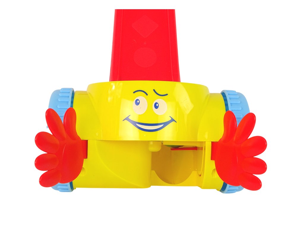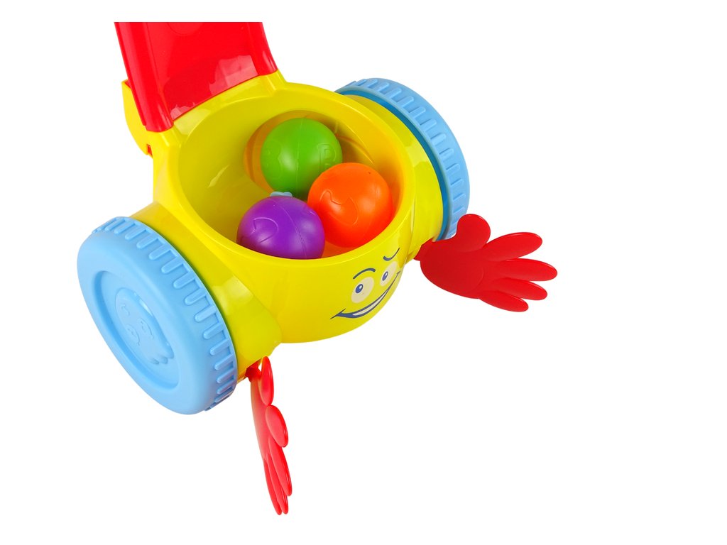 Детето хвърля топчето в дръжката. Тласкачът събира топчетата, върти се заедно с тях и после скача на пода, за да ги събере отново. Определено детето ще се опитва да хване въртящото се топче. Такава игра не само физически развива детето, но и го учи да решава задачи. Физическата активност подпомага развиването на мускулите и моторните умения. Ярките цветове и весела музика на заден план стимулират развитието на слуха и зрението.
