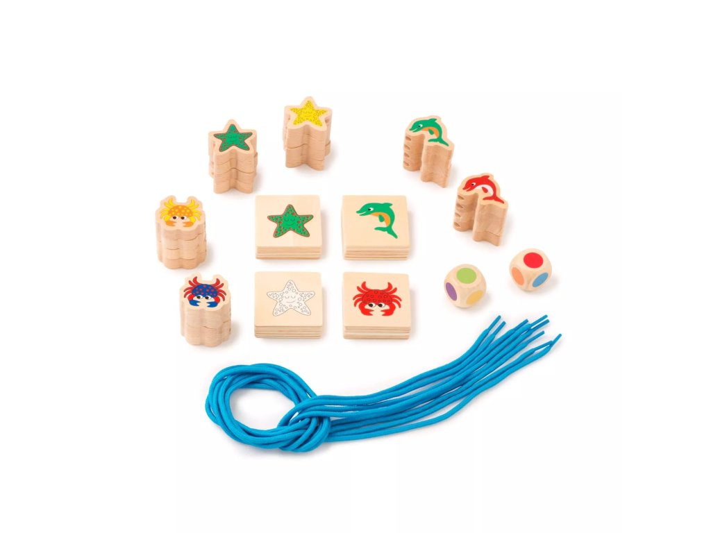 Комплектът за нанизване на марката Toys for Life предлага забавление за момчета и момичета. Хвърлете цветните зарчета и промушете връвта през морските животни със съответните цветове. Като алтернатива може да се постави серия от карти и да се нанижат животните в същия ред.