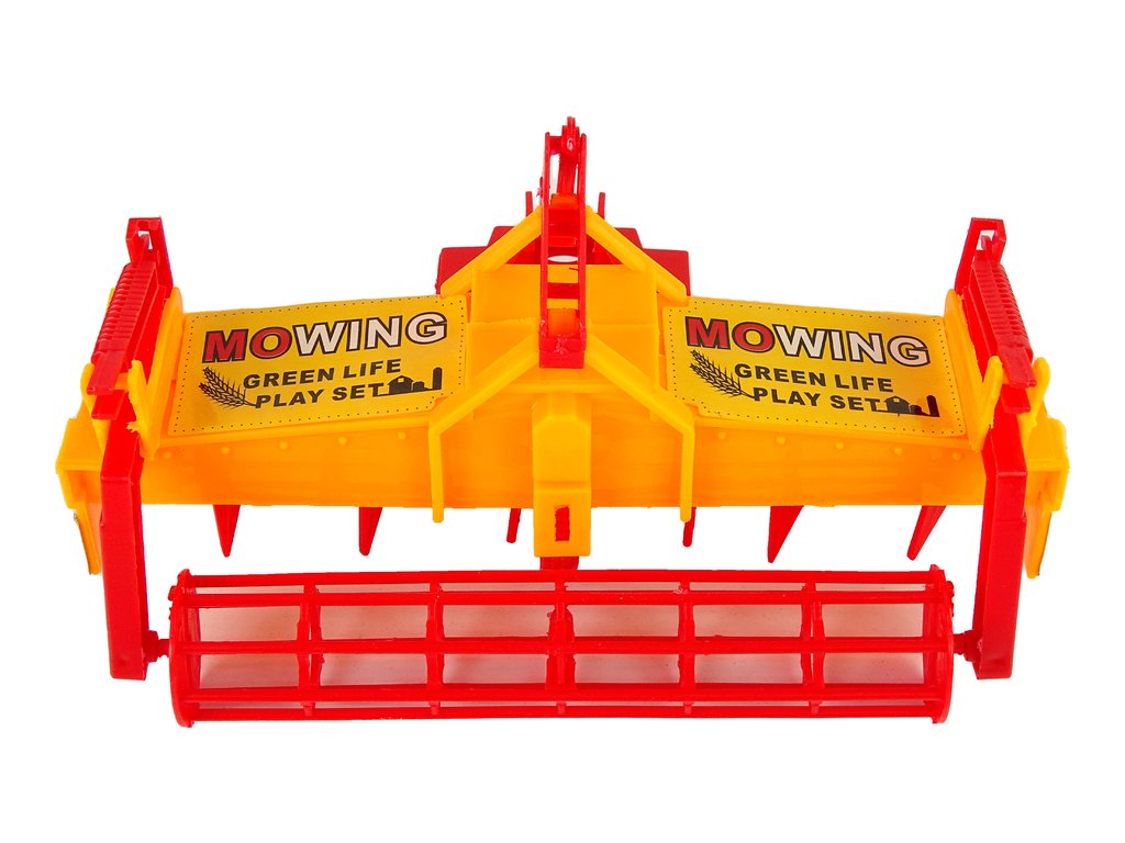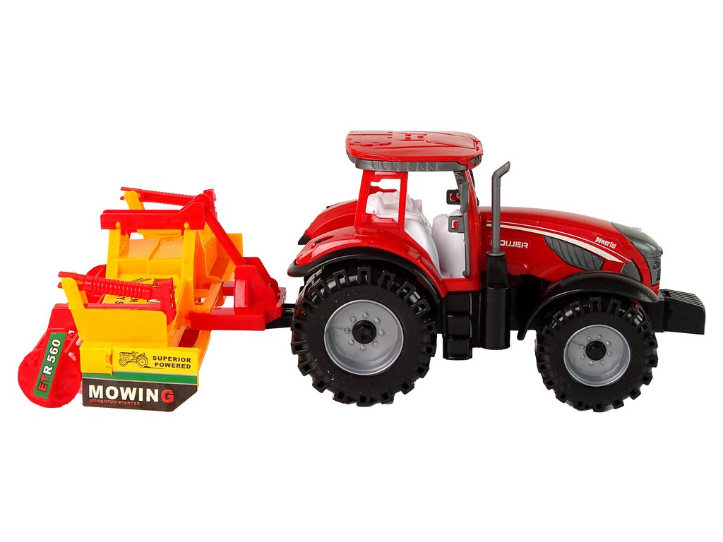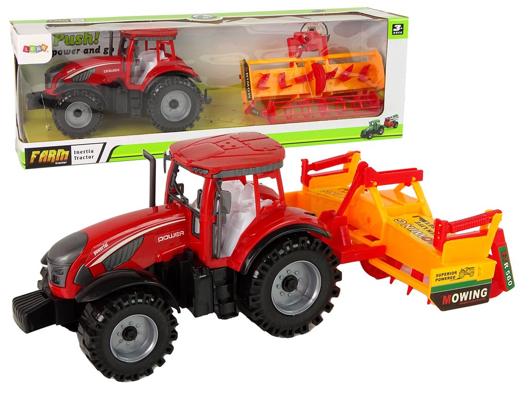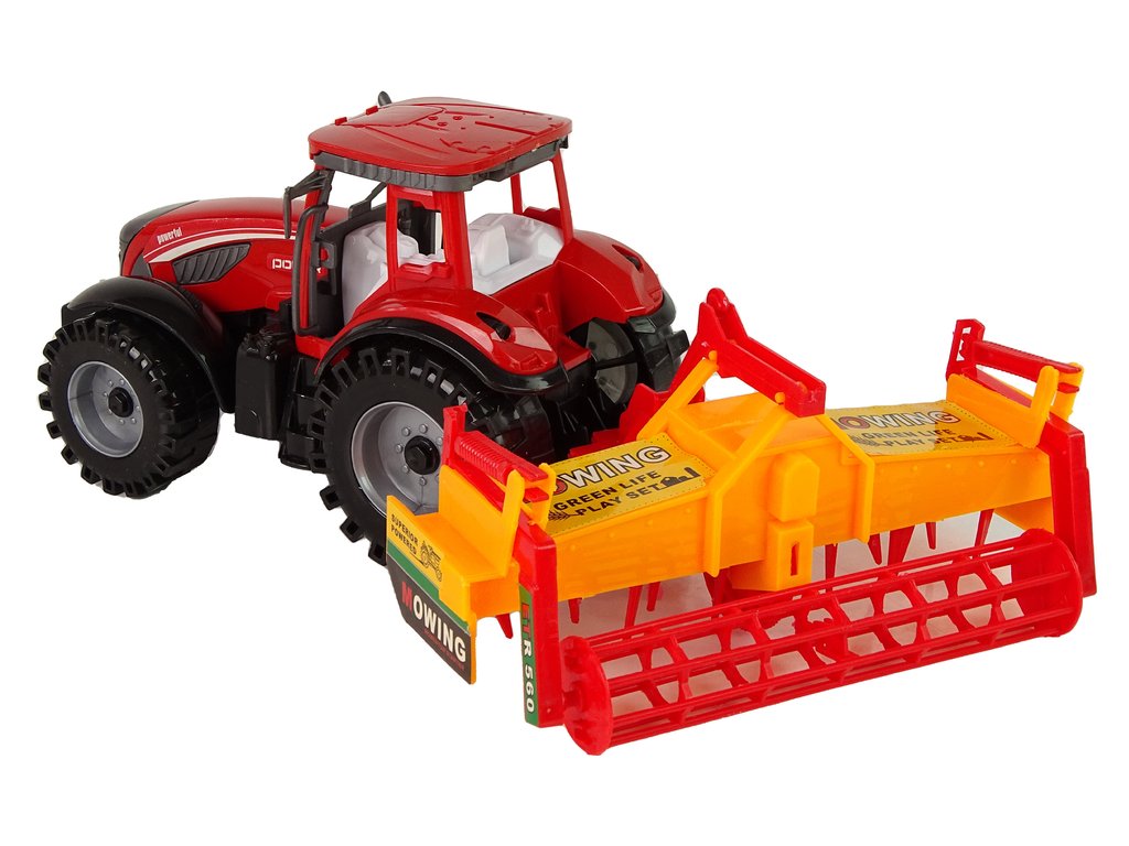 Комплектът съдържа червен трактор с оранжево-червен култиватор, който може да се прикрепи към задната част на превозното средство, осигурявайки още повече забавление на детето. Тракторът е оборудван с триене за движение напред, което му позволява да се придвижва самостоятелно. Подвижните части имитират работа на полето и предоставят възможност за вълнуващи приключения на детската ферма. Тракторът е изработен от висококачествена пластмаса, която гарантира дълготрайност и безопасност по време на игра.