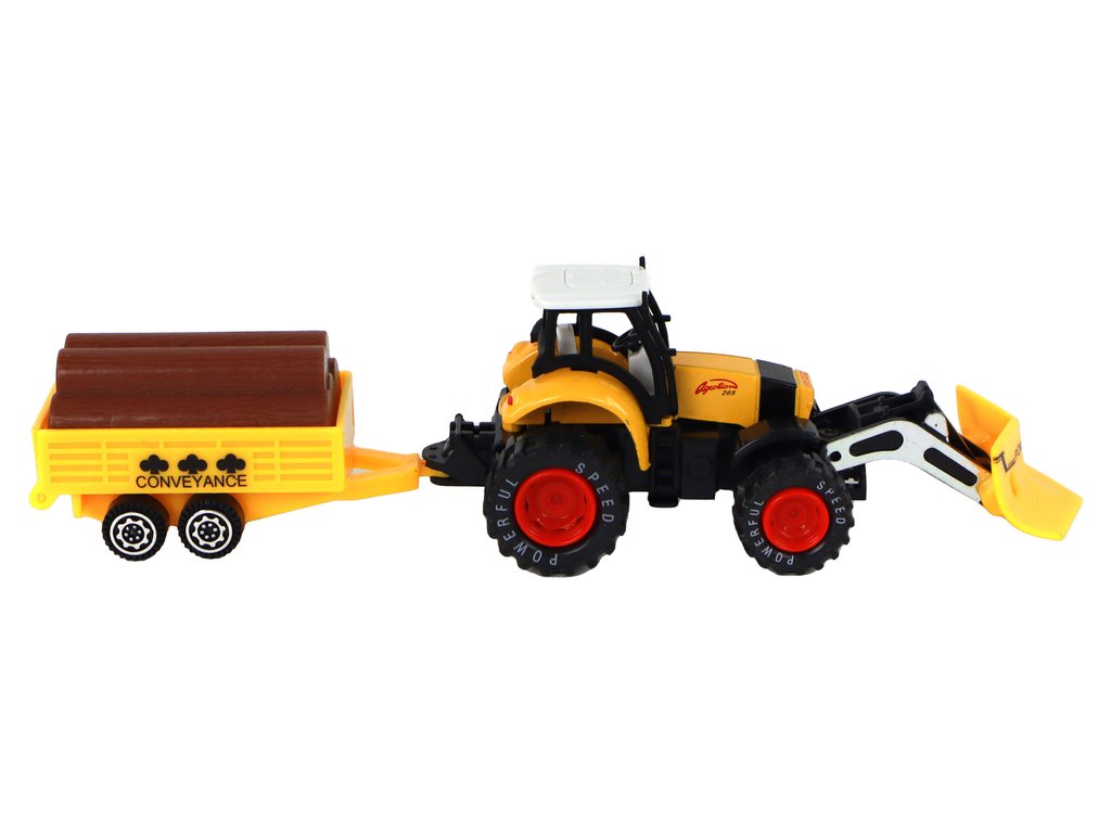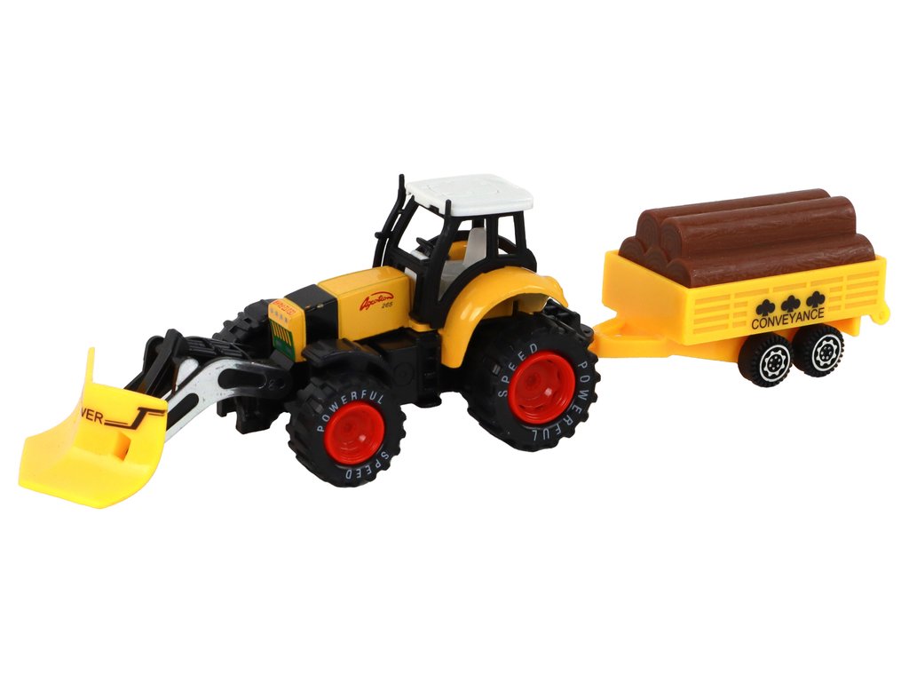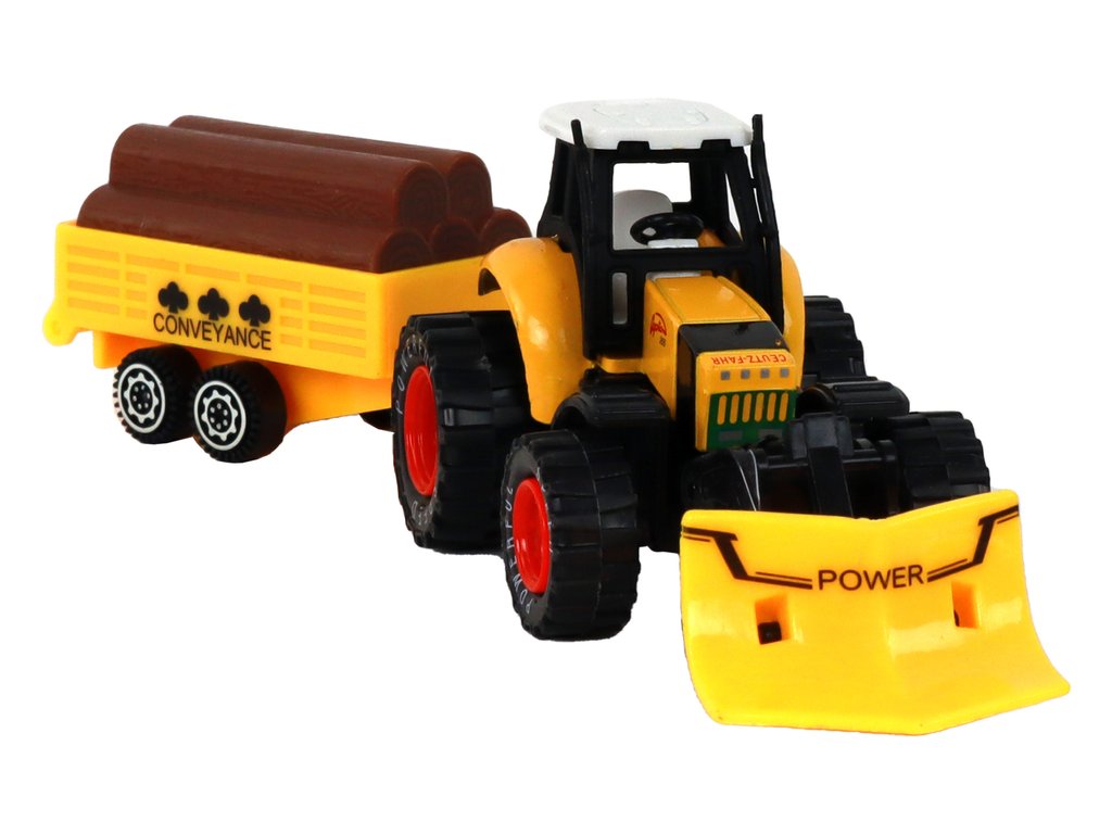 Трактор с ремарке за дърва жълт разполага с здрави и масивни колела, предназначени да преодоляват различни видове терени и препятствия. В предната част на трактора има булдозерна лопата, която може да се отделя и прикрепя според игровите нужди. Децата могат да пресъздават разнообразни сценарии, свързани със селскостопанска работа или строителство. Тракторът е оборудван с фрикционен мотор за плавно движение.