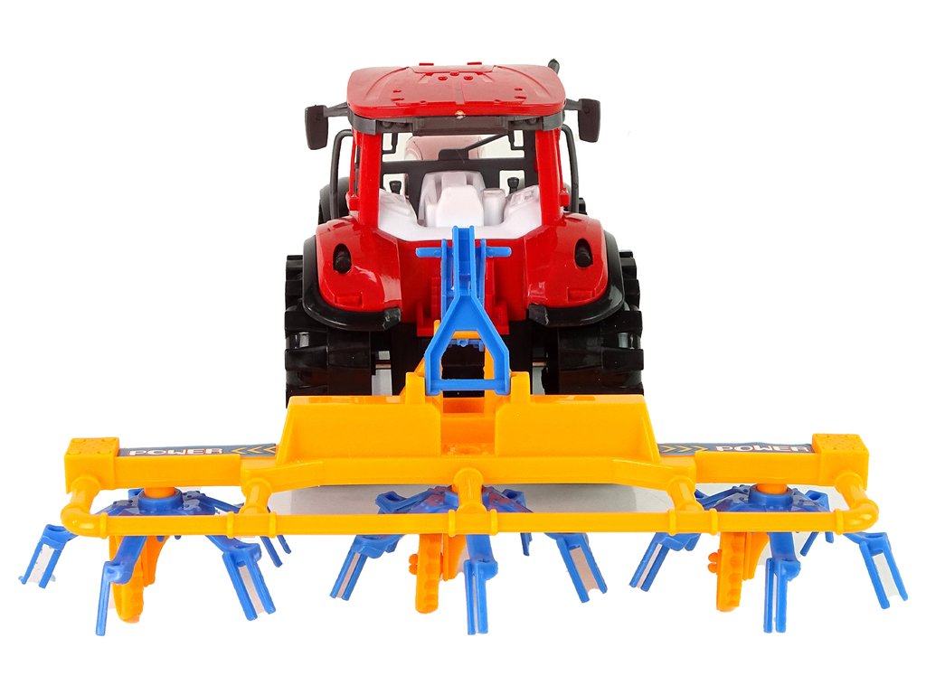В този комплект ще откриете червен трактор с триене, снабден с балирачка, монтирана на задната част на превозното средство. Тракторът разполага с триене като задвижване, което му позволява да се движи напред и назад. При движение частите на балирачката се движат.