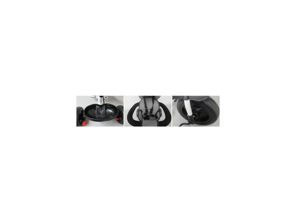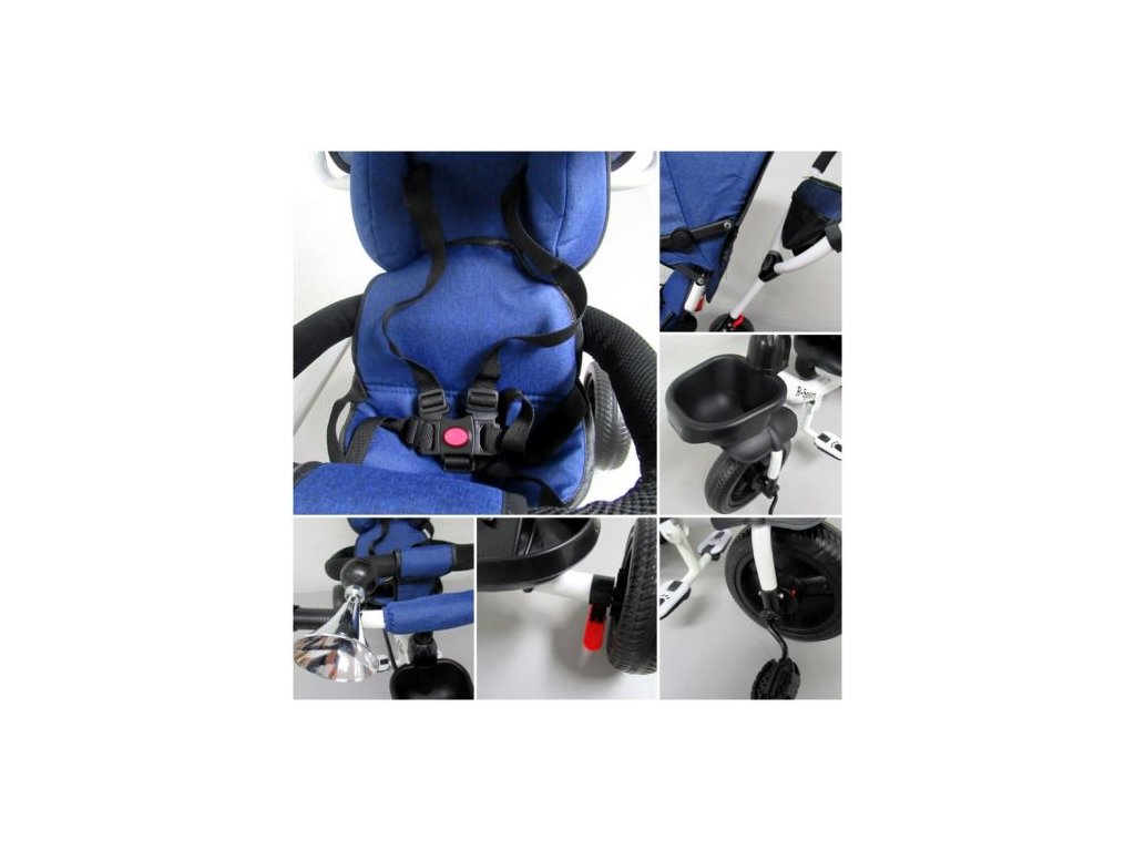 Детската триколка T4 R-Sport с EVA колела тъмносиня пристига със безшумни пяна EVA колела, които се адаптират към различни терени. Детето сяда в удобно оформеното седалка, а безопасността е гарантирана от предпазни колани.