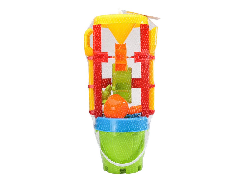 В комплекта е включено и здраво кофа, която е незаменима част от играта, както и лопатка, гребло, лейка и 4 формички за пясък.
