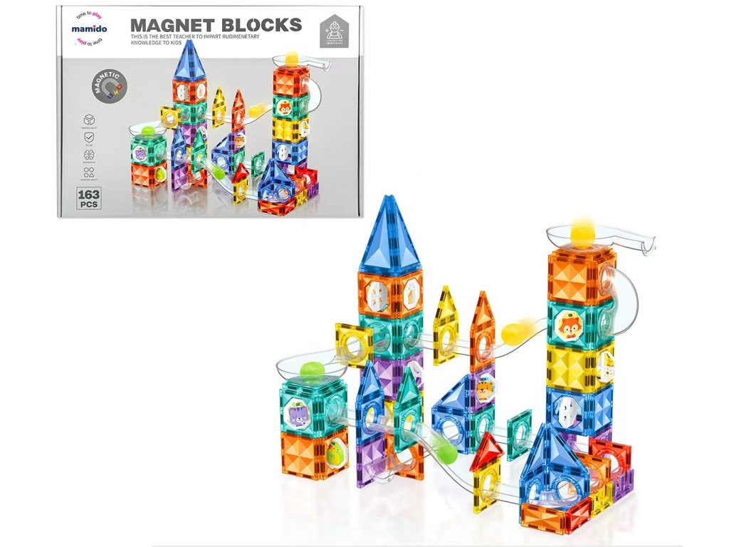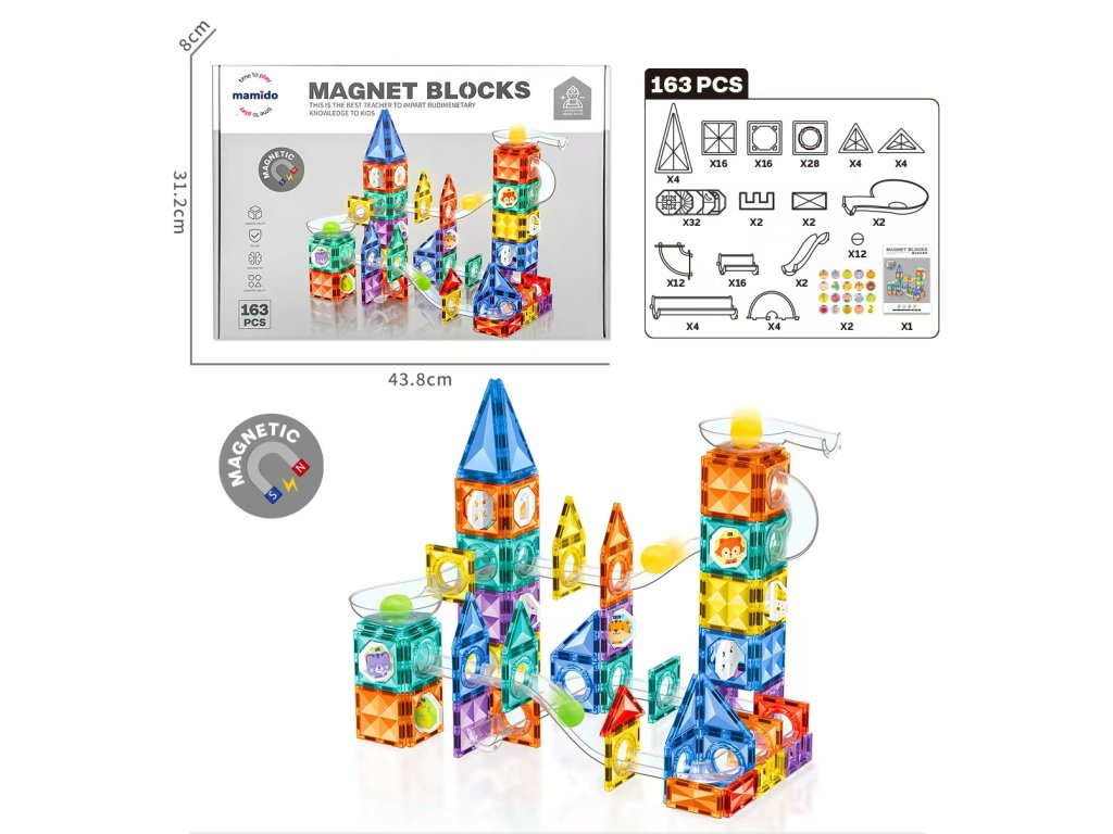 Цветните магнитни блокчета с различни форми се свързват лесно и позволяват изграждането на високи кули, мостове или цели конструкции. Благодарение на пистата за топчета, децата могат да наблюдават как топчетата преминават през трасета, пълни със завои, дъги и препятствия – играта става още по-напрегната и интерактивна.