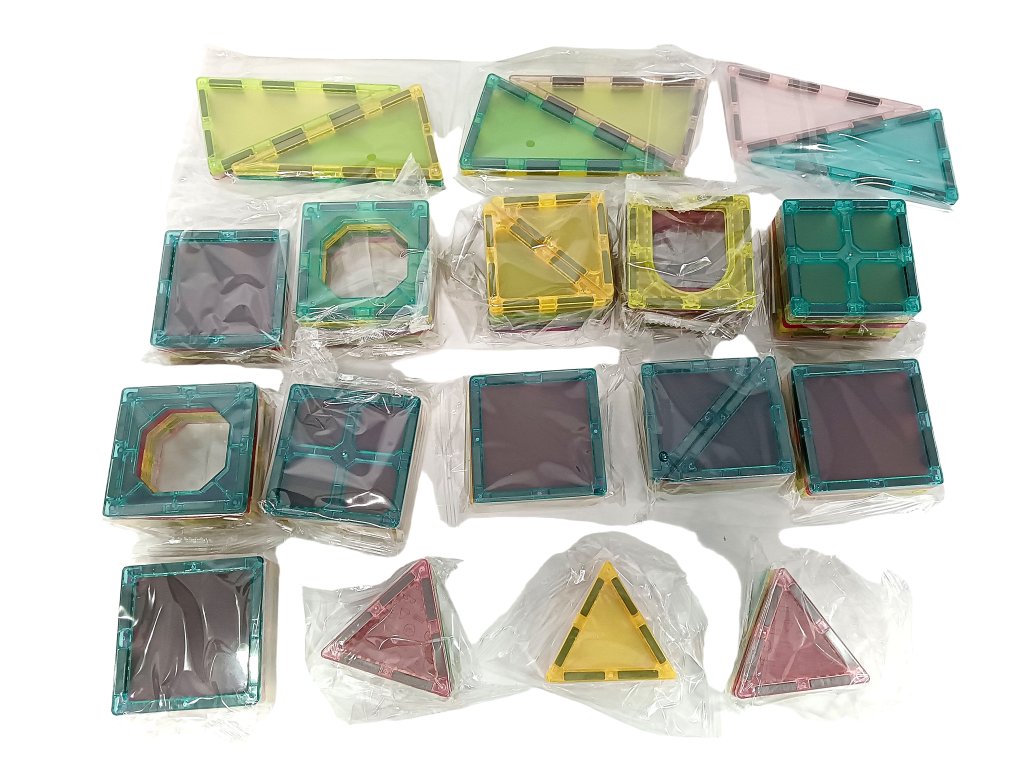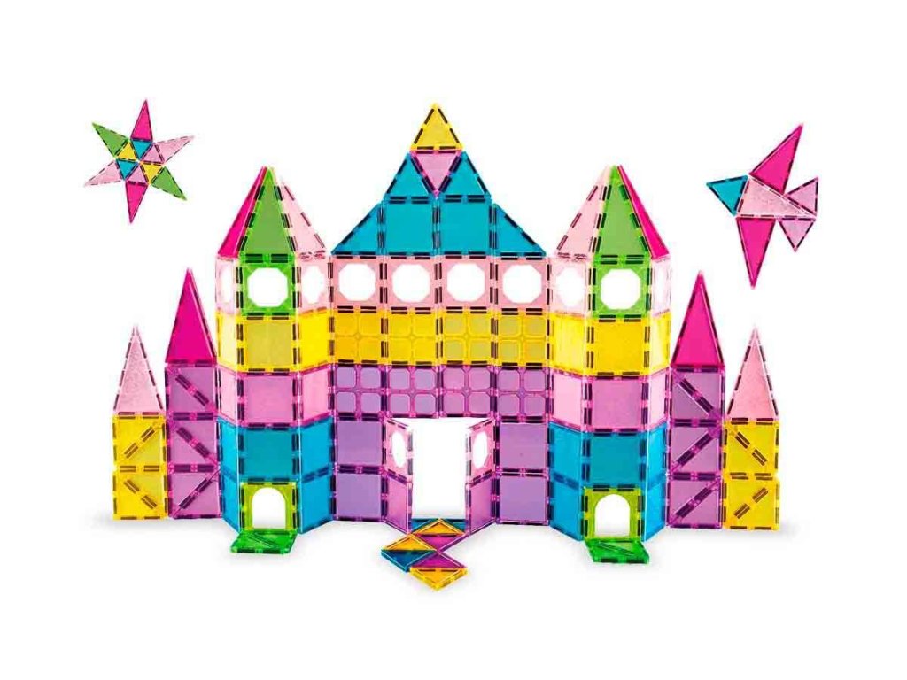 Вълшебен комплект от 118 магнитни плочки с размер 7,5 см отваря свят на фантазията, където децата могат да строят замъци, къщички, кули и свои собствени цветни светове. Прозрачните елементи създават красиви светлинни ефекти и се задържат отлично благодарение на силните магнити. Конструкторът е идеален за малки строители, които обичат креативното комбиниране на форми.
