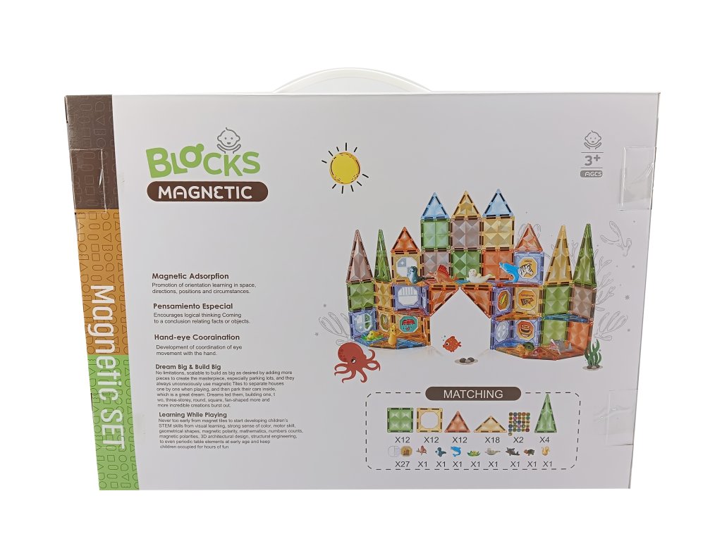 Цветният магнитен конструктор "Подводен свят" предлага 93 части с размер 7,5 см, които позволяват на децата да строят замъци, кули, морски дворци и фантастични постройки, вдъхновени от подводния свят. Комбинацията от прозрачни цветни части и тематични картинки създава красиви ефекти и насърчава креативната игра.