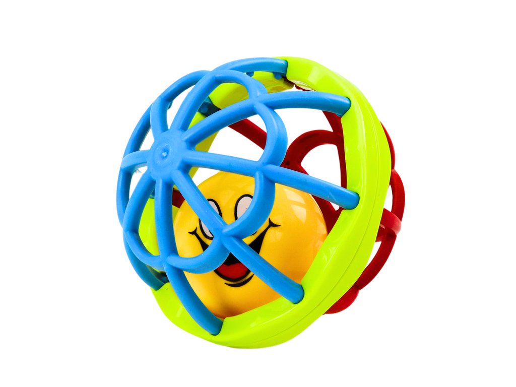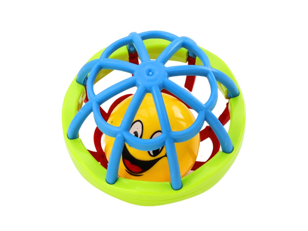 Вътре в топката се намира пластмасово жълто топче, което при движение издава приятен дрънкащ звук. Този интерактивен елемент не само буди любопитството на детето, но и подпомага развитието на двигателните умения и координацията на движенията.