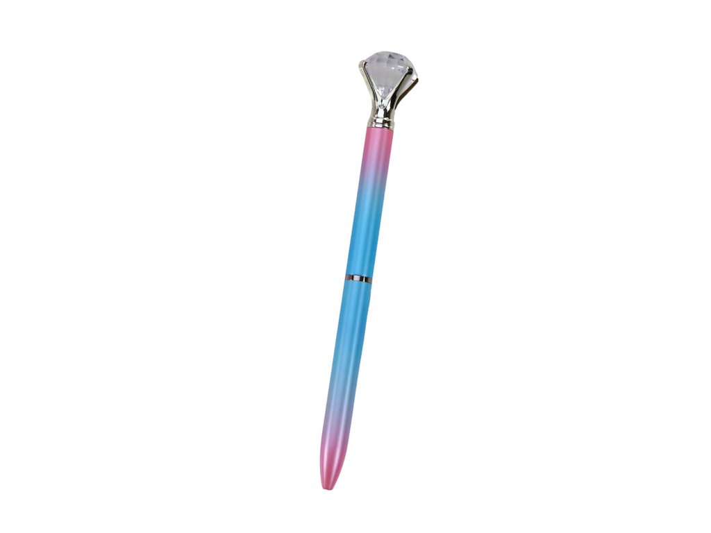 Това изключително цветно писалка с топче с диамант 0,7 мм синьо съчетава елегантност и функционалност. Върху върха ѝ е поставен голям блестящ диамант, който ѝ придава вечен стилен вид. Писалката е в син нюанс с розови и лилави тонове.