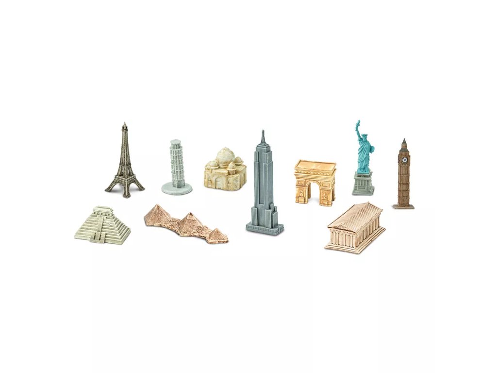 Комплект ръчно рисувани миниатюрни реплики на значими сгради от света. Фигурките са произведени с акцент върху прецизността и детайла, което улеснява децата да разпознават и разбират отделните сгради. Обикновено имената на английски език са посочени на долната страна на фигурката.