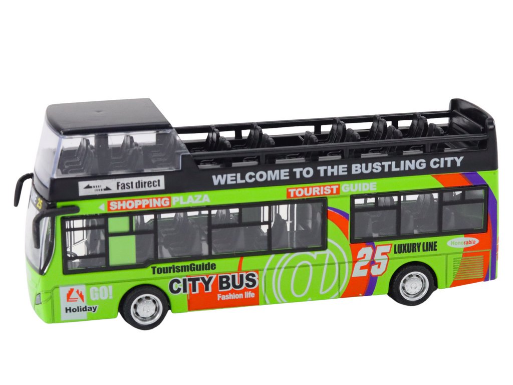 Туристическият двуетажен автобус 1:32 със сводящи се врати зелен е отлична играчка за всички малки фенове на автомобилните модели. Този реалистично изработен модел впечатлява с първокласно качество и детайлна изработка – от прозрачното застъкляване с видими седалки и волан до металната конструкция, осигуряваща здравина дори при интензивна игра. Автобусът разполага с функция Pull Back задвижване, която позволява лесно придвижване след издърпване назад, както и светлинни и звукови ефекти за още по-забавно преживяване.