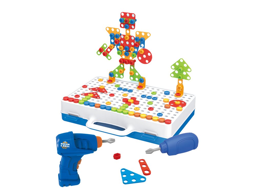 Творчески панел с бормашина 248 части ще зарадва всеки малък строител и ще го научи на търпение и прецизност. Винтовете за завинтване позволяват създаването на двуизмерни и триизмерни модели.